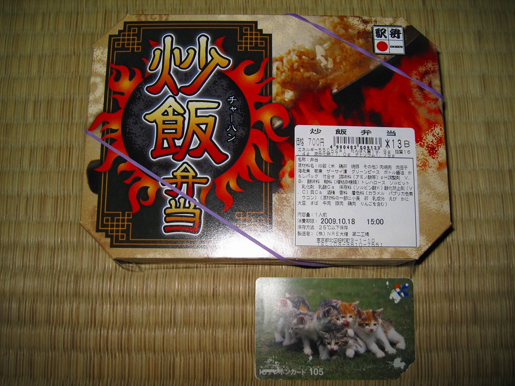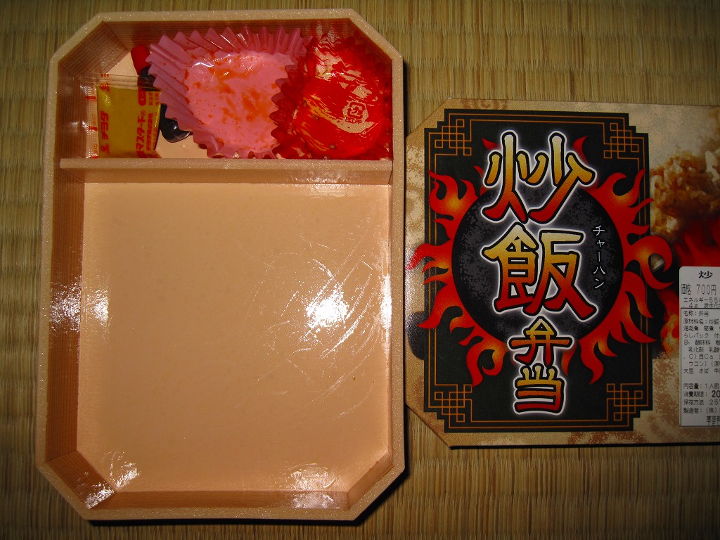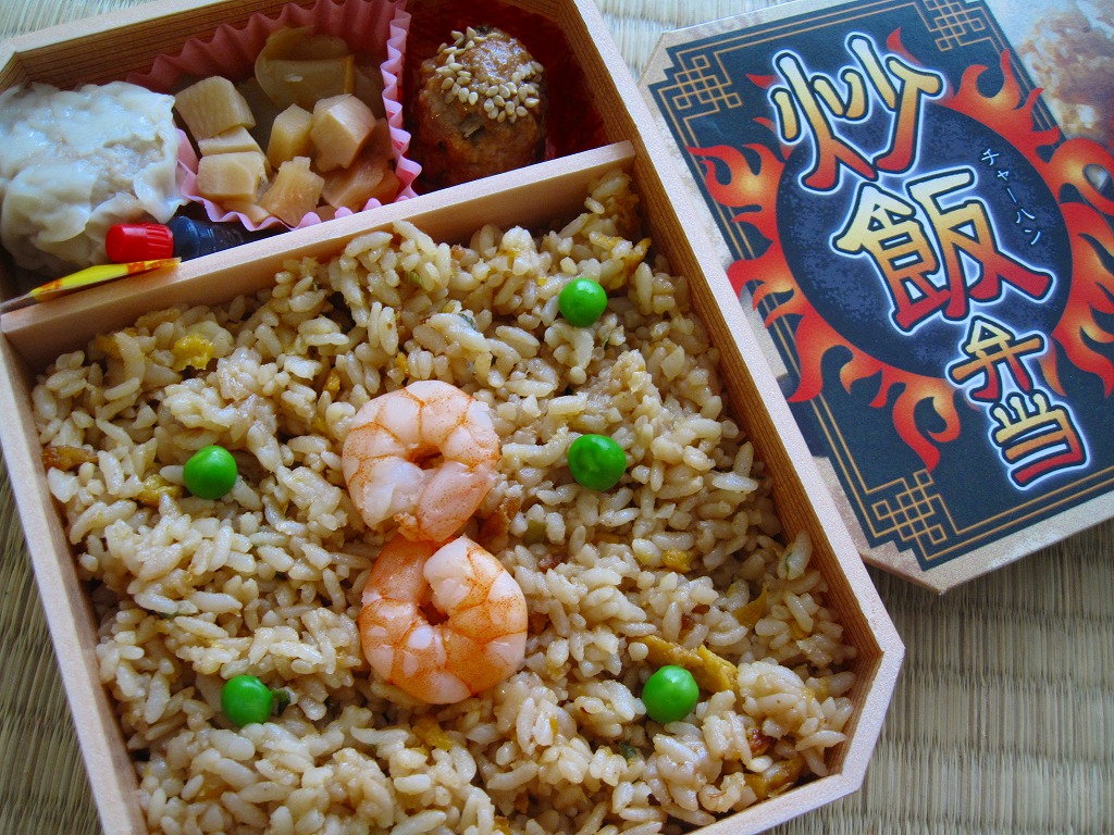 2009(平成21)年の夏頃に発売か。発泡材で角を落とした小柄な長方形の容器に、小エビとグリーンピースを振ったチャーハン、焼売、肉団子、タケノコ煮とザーサイを詰め、透明なシートをかけて、駅弁の名前とそのイメージを印刷したボール紙のふたをして、太い輪ゴム1本で留める。