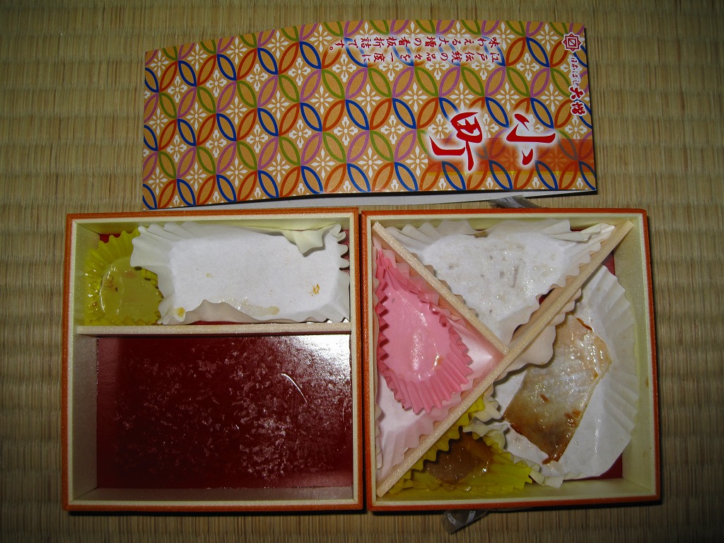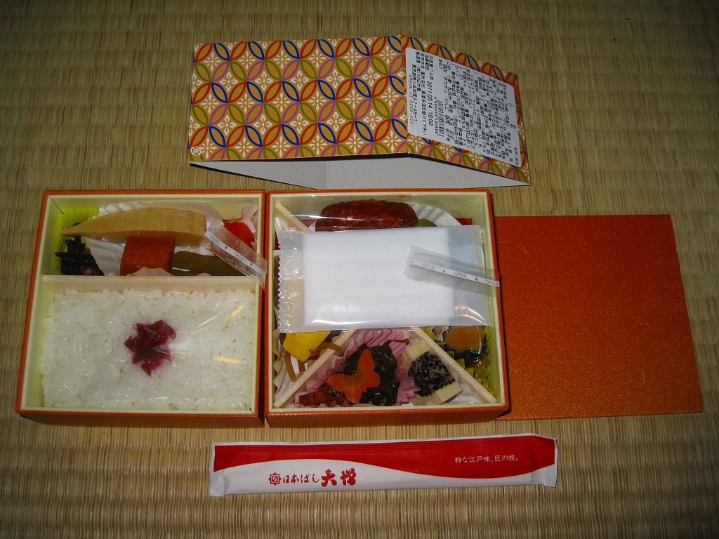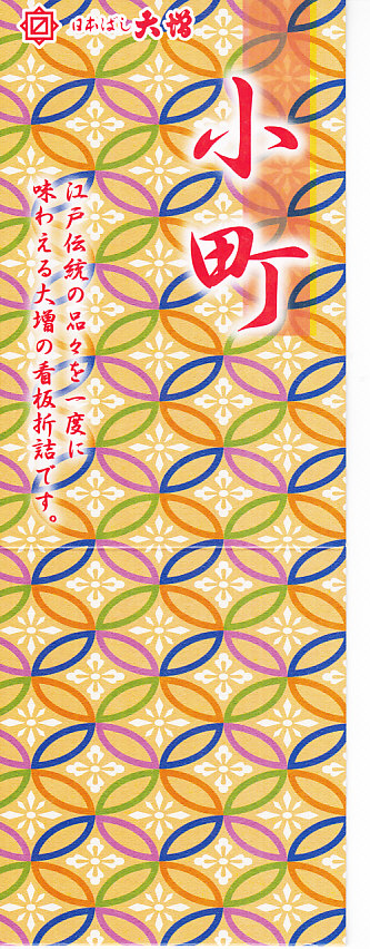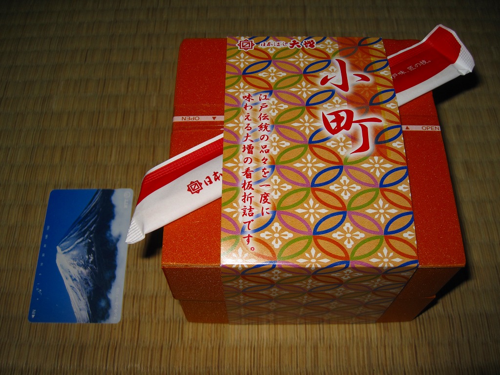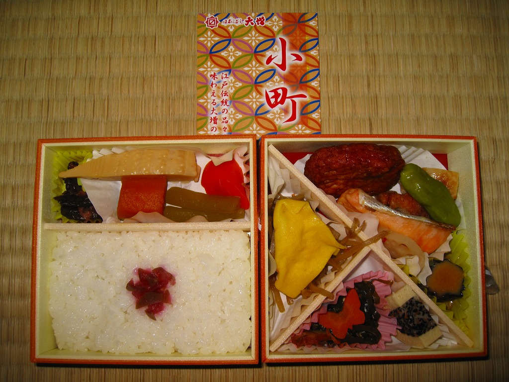 デパ地下でおなじみの幕の内弁当屋「日本ばし大増」の、懐石料理折詰メニューのひとつで、なぜか東京駅の駅弁売店で販売されていたもの。朱色の正方形の容器を二段に重ねて、商品名と宣伝文句を書いたボール紙で留める。中身は下段が白御飯にニンジンやタケノコなどの煮物、上段が鶏つくね、サーモン味噌焼、鶏肉味噌焼、きんぴらごぼう、ナス田楽、昆布煮など。