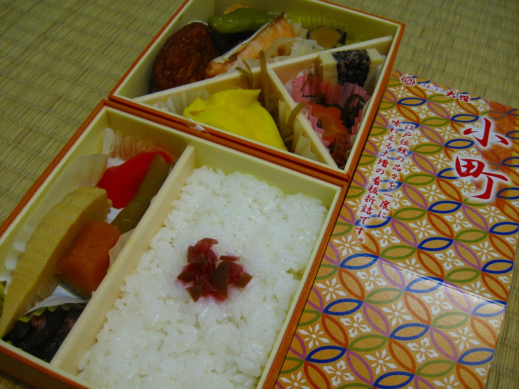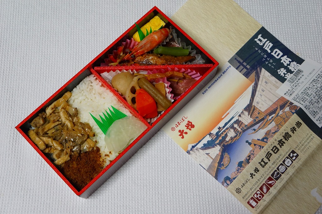 2018(平成30)年8月1日に東京駅の駅弁売店「膳まい」3店舗で発売。掛紙の絵柄は江戸時代の日本橋付近の運河の風景だろうか。中身は左側で白飯をあさりと牛蒡の深川煮、「にんべん」味付おかか、べったら漬で覆い、右側にサバの江戸味噌煮、いんげん、有頭海老煮、玉子焼、焼き合鴨串、サトイモやゴボウなどの江戸うま煮、野菜のしそ酢和えと「桃屋」江戸むらさきごはんですよ!のおかず。見た目は駅弁風で、中身はデパ地下風な、東京の雰囲気を持つお食事。