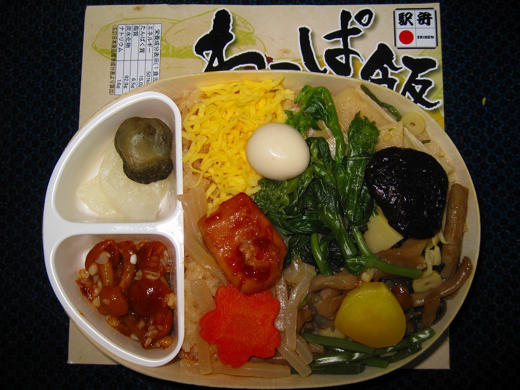 東京駅で最も売れる駅弁のひとつ。やや味気ない楕円形の薄い樹脂容器に、透明なふたをかけてボール紙の枠にはめる。中身は茶飯の上にタケノコやホタテやコンニャクやレンコンなどの煮物に鶏照焼と甘い栗を載せて、きんぴらと小茄子漬と和菓子を添える。