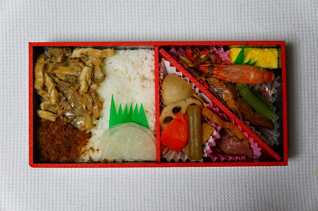 和風の絵柄を持つ赤い掛紙にも、ブランドネームのみが記される。大きめな正方形の容器を斜めの井形に仕切り、中央にタケノコとホタテと花にんじんと菜の花を載せた茶飯を据え、周囲をごぼうやサトイモなどの煮物、鶏つくねと山菜漬、野菜入り巾着とふきと切昆布煮、赤魚白醤油焼とにしん昆布巻とタケノコのきんぴらで囲む。内容でなくブランドと構成で東京あるいは都会を感じさせる、新幹線の車内で駅弁のようにいただけるお弁当。
