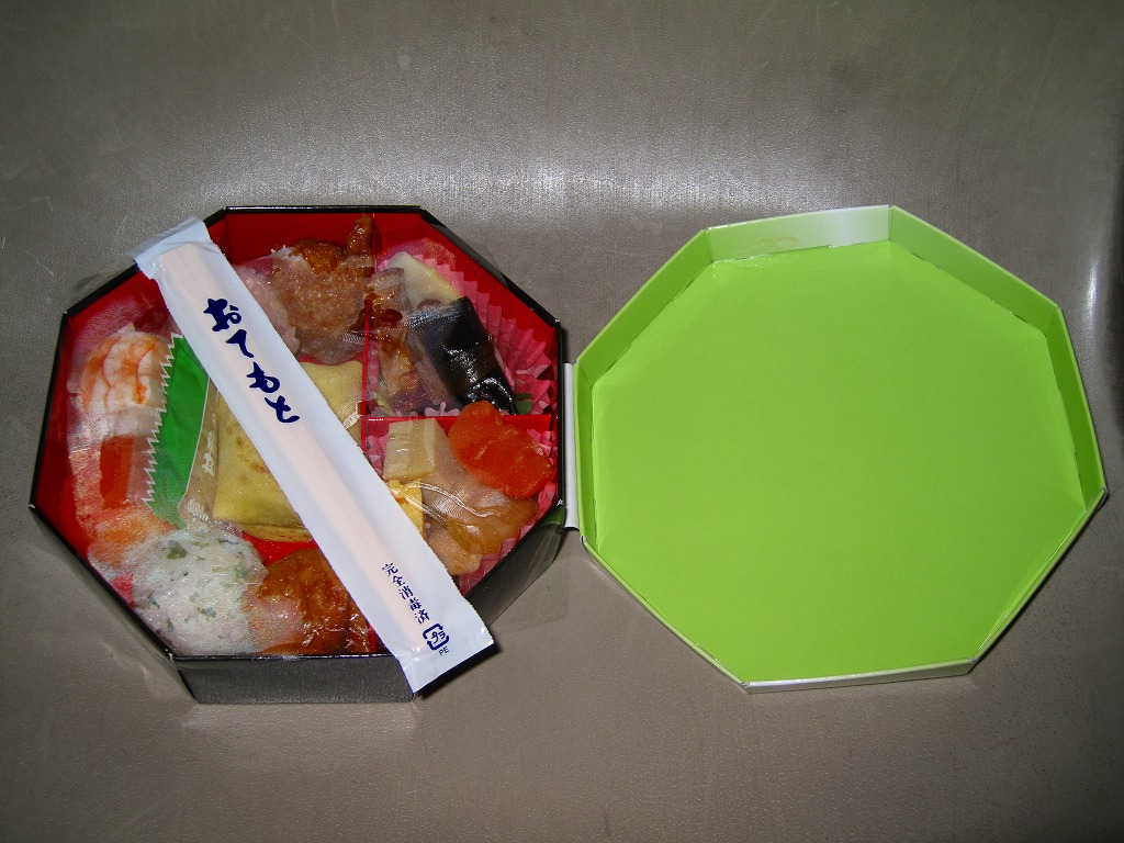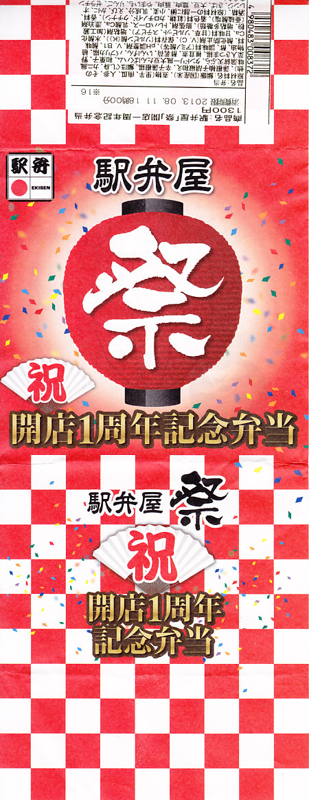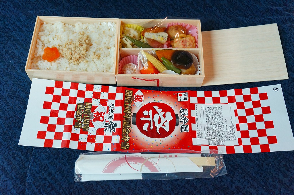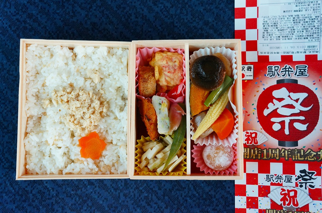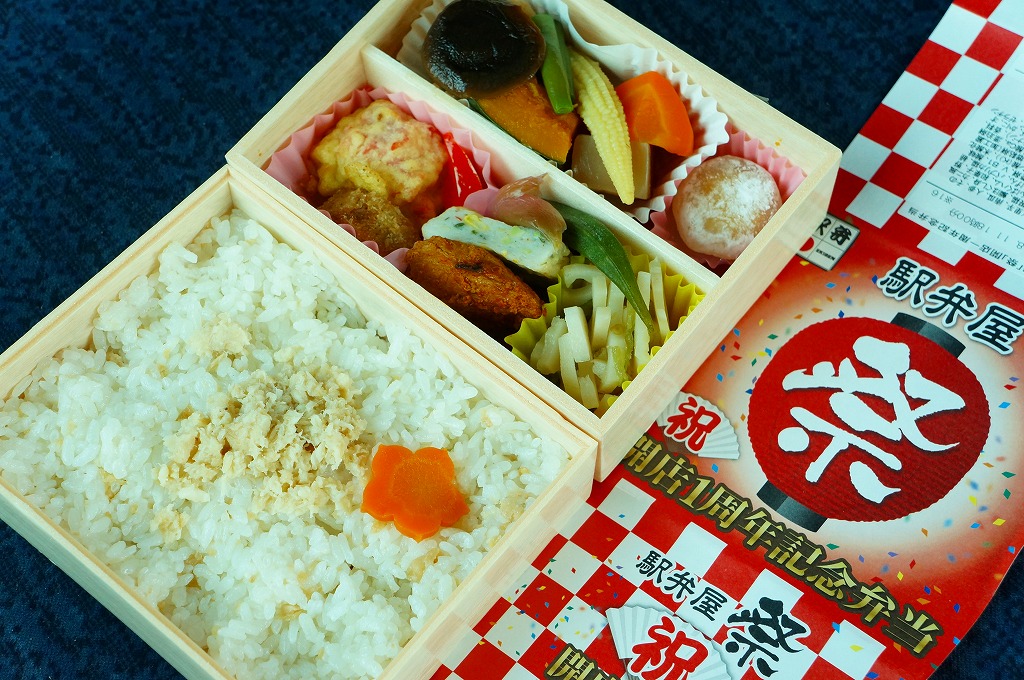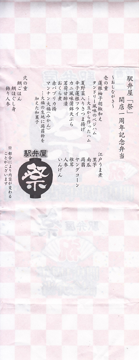 2013(平成25)年8月9日から18日まで、東京駅の駅弁売店「駅弁屋 祭」で開催された、「「駅弁屋 祭」開店1周年記念駅弁大会」の期間限定商品3種類のうちのひとつ。お祝いの掛紙に包まれた二段重ねの容器の中身は、下段が鯛飯、上段がサトイモやシイタケやカボチャなどの煮物、レンコンの柚子胡椒和え、からしれんこん、カニかま天、大豆たんぱく、薩摩揚げ、和菓子など。柔らかい鯛飯に振る鯛ほぐし身は柔らかくてみずみずしく、上段の焼き物や練り物や揚げ物などは自然に鮮やかで、10日間で売り止めるには惜しい内容。