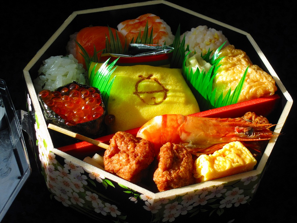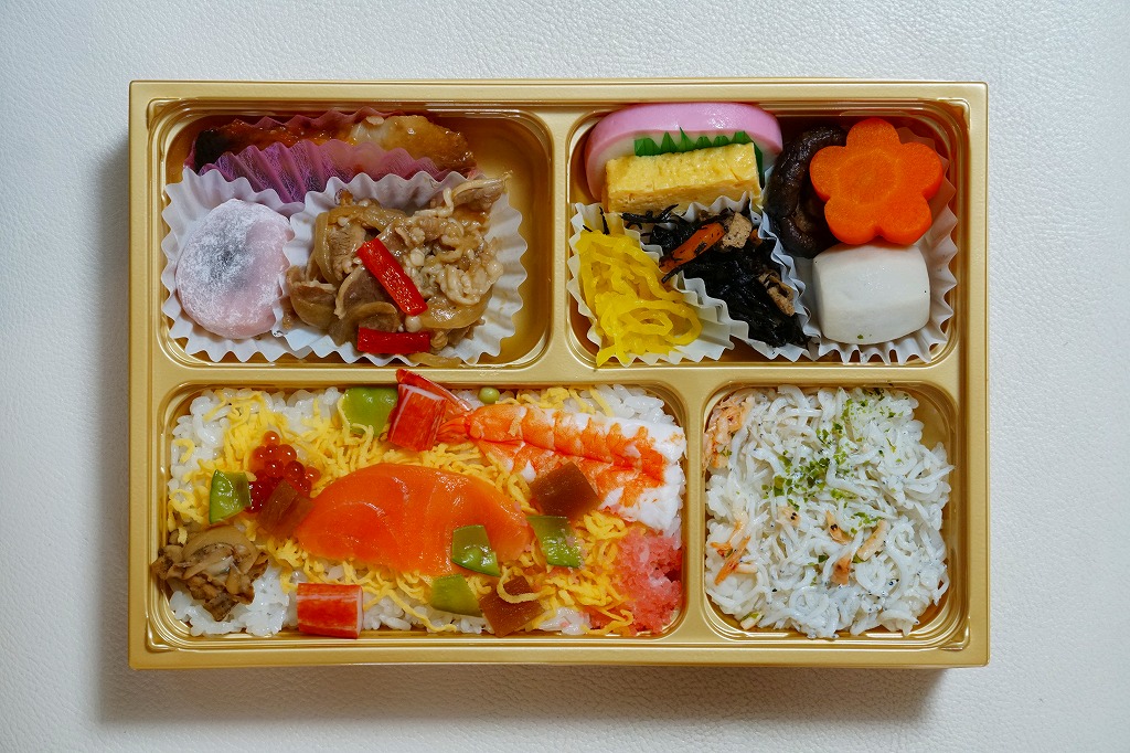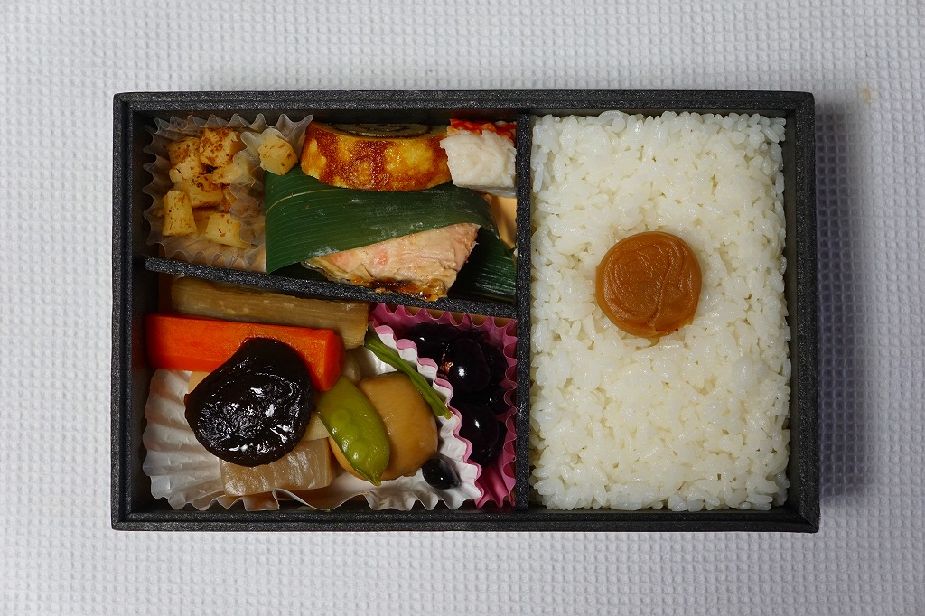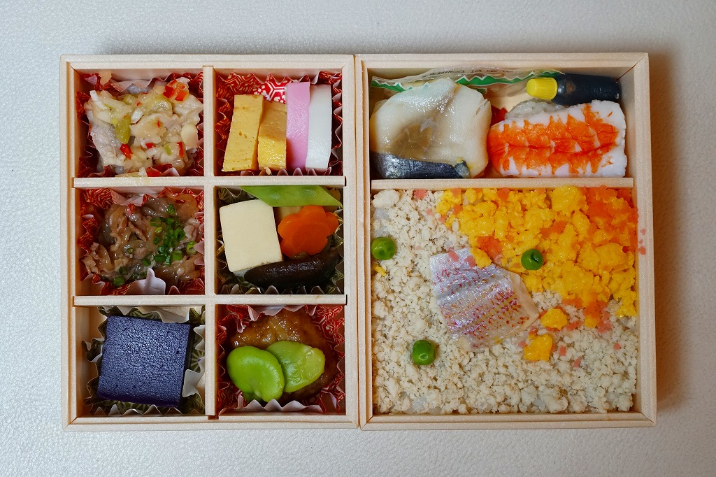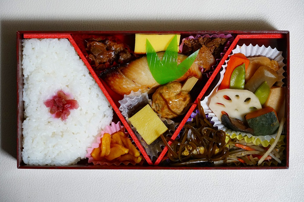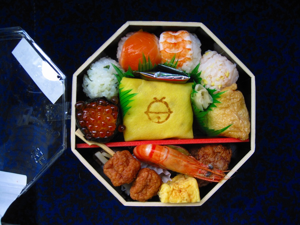 2013(平成25)年8月9日から18日まで、東京駅の駅弁売店「駅弁屋 祭」で開催された、「「駅弁屋 祭」開店1周年記念駅弁大会」の期間限定商品3種類のうちのひとつ。お祝いの掛紙に包まれた二段重ねの容器の中身は、下段が鯛飯、上段がサトイモやシイタケやカボチャなどの煮物、レンコンの柚子胡椒和え、からしれんこん、カニかま天、大豆たんぱく、薩摩揚げ、和菓子など。柔らかい鯛飯に振る鯛ほぐし身は柔らかくてみずみずしく、上段の焼き物や練り物や揚げ物などは自然に鮮やかで、10日間で売り止めるには惜しい内容。