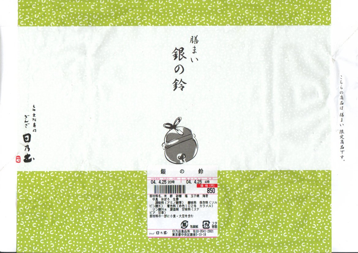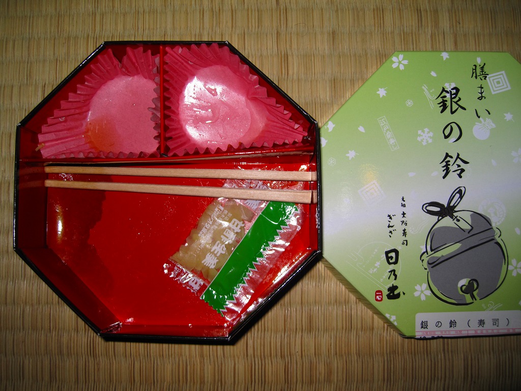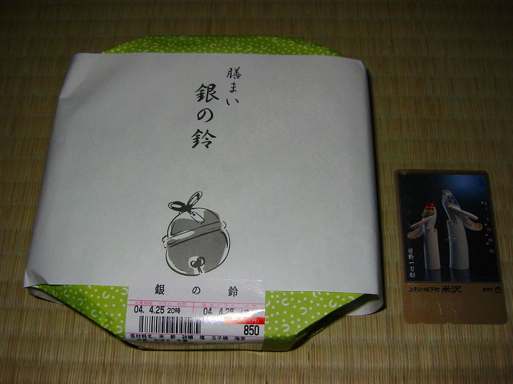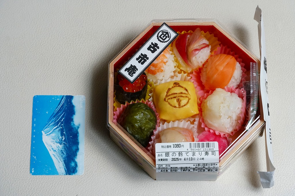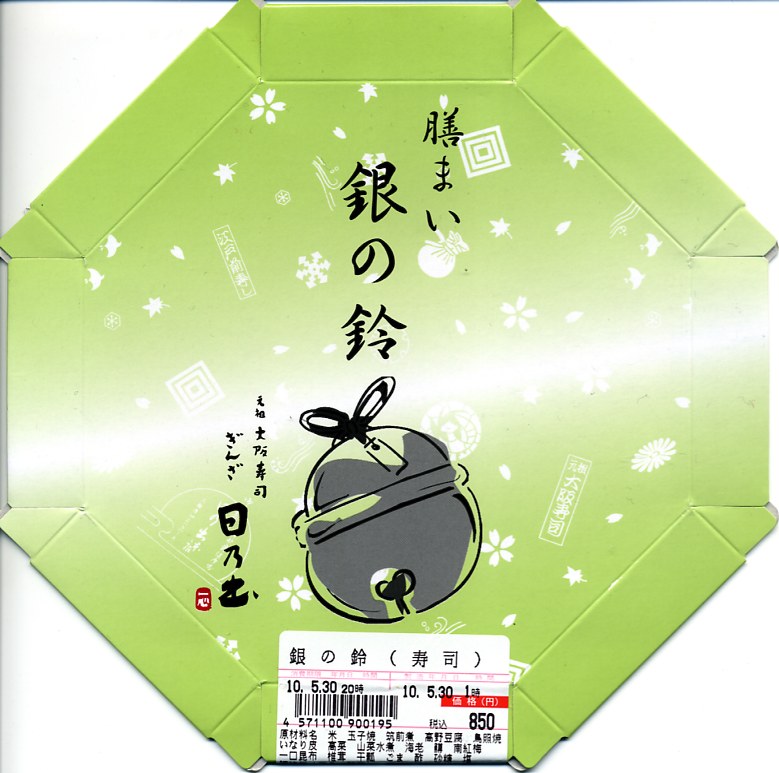 東京駅の銀の鈴弁当の、2004(平成16)年時点での姿で、2003年の発売当時の姿。正八角形の容器に透明なふたをかけて割りばしを添え、草色の包装紙で包み、帯状の掛紙を巻いていた。中身はサーモンや海老やいなりなどの手まり寿司7個に玉子焼や竹の子煮や山菜など。中央に入る茶巾寿司には銀の鈴の焼印が入る。東日本キヨスクの弁当売店「膳まい」での取り扱い。