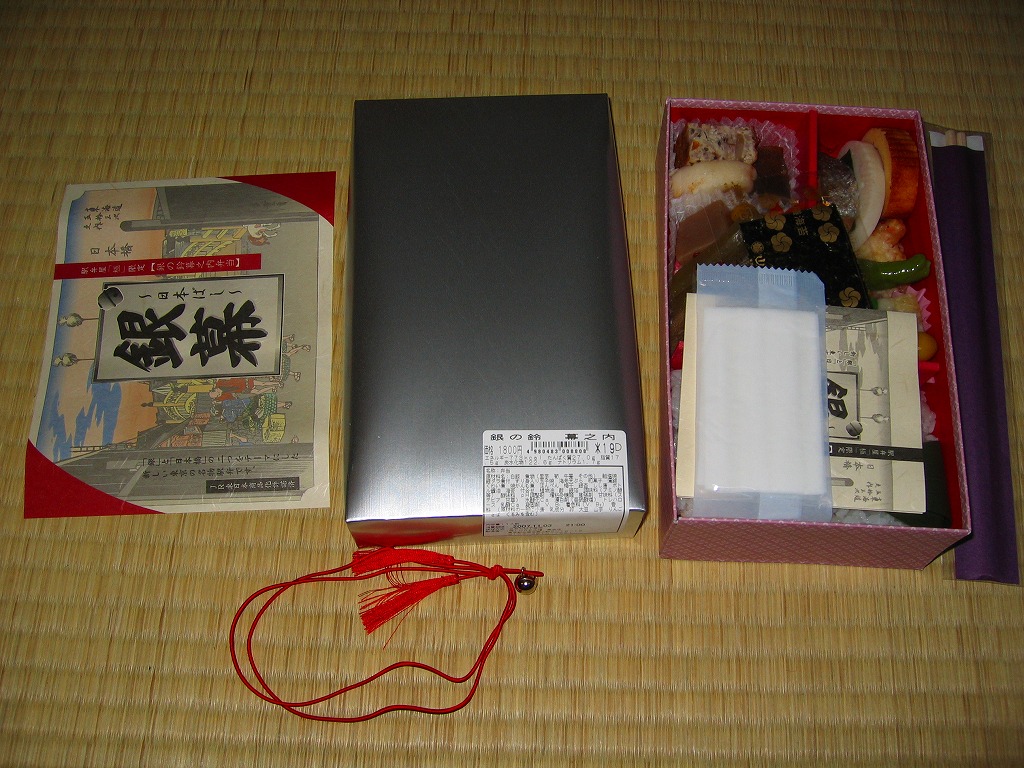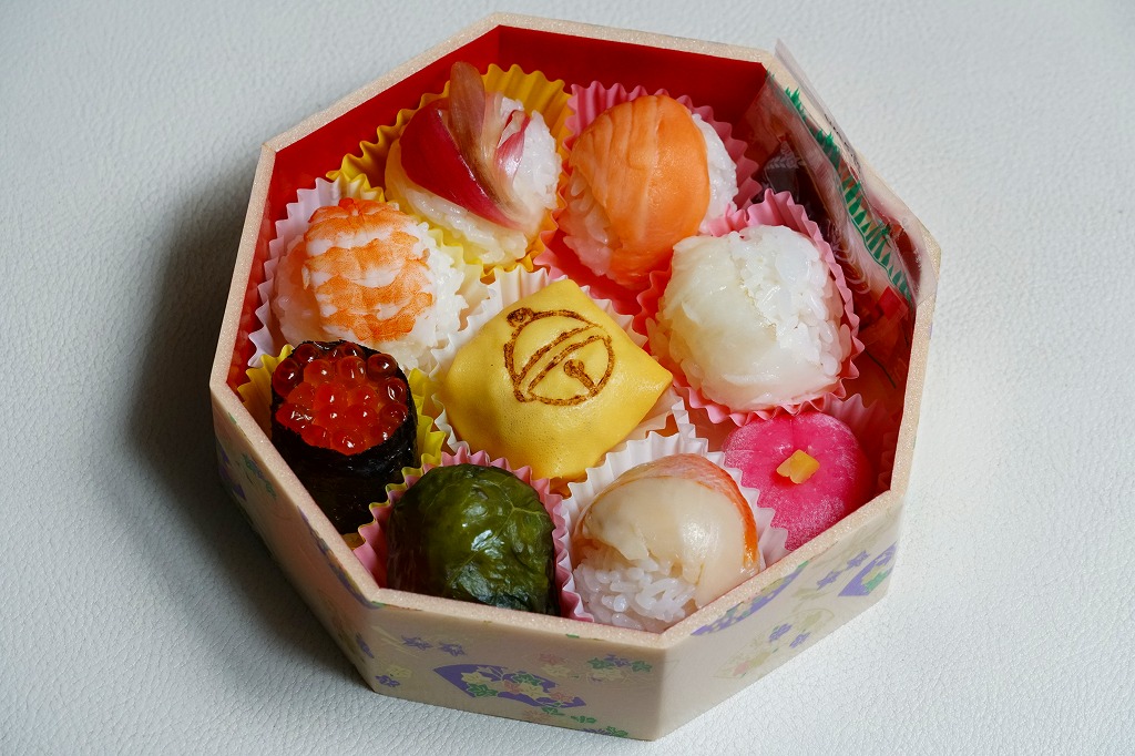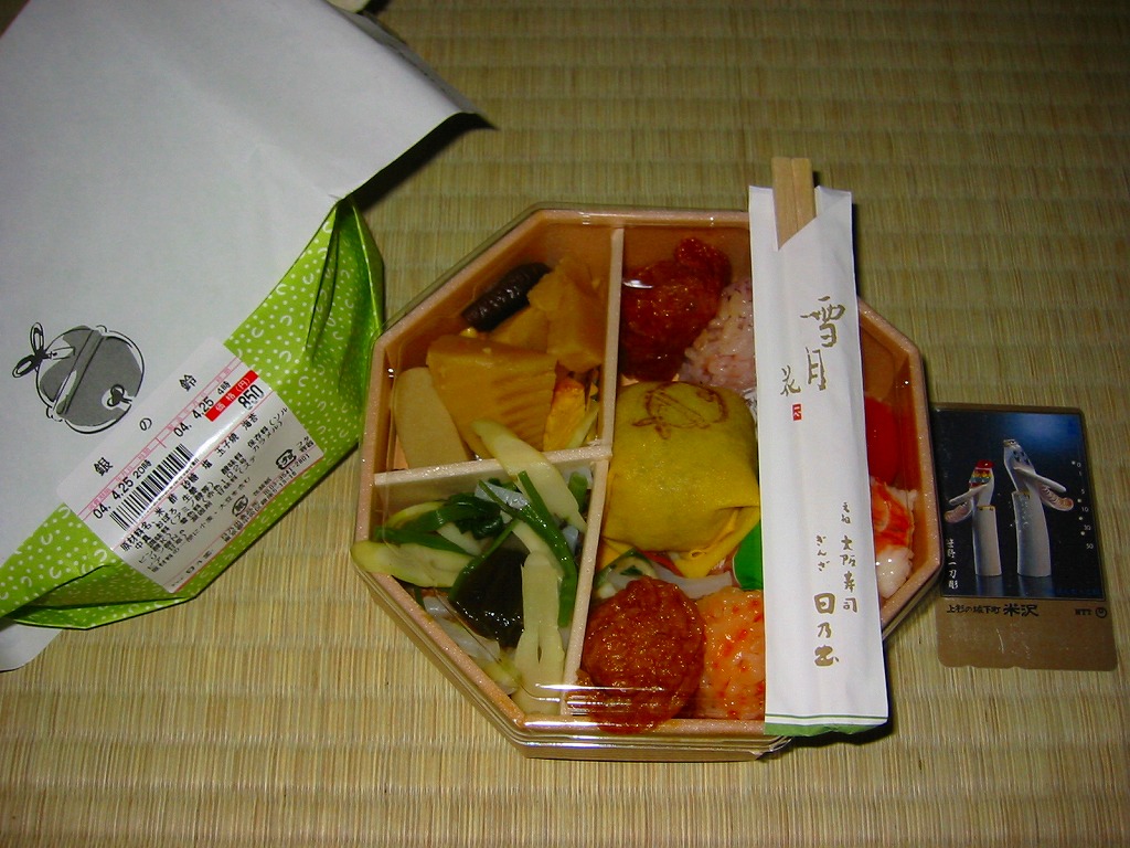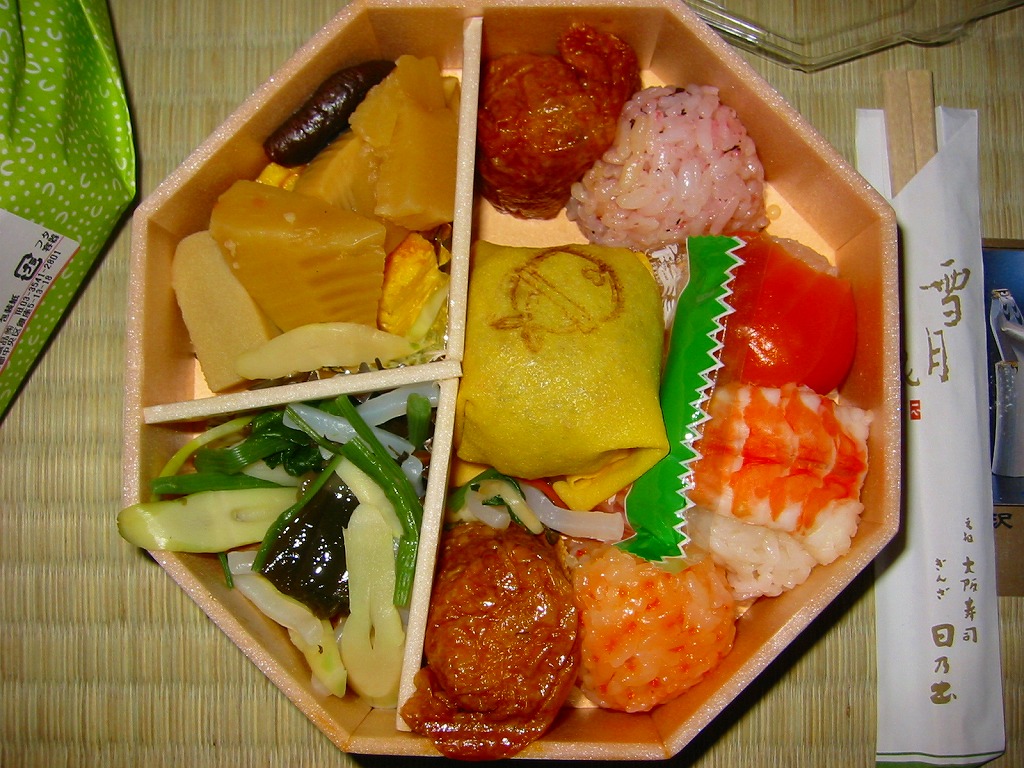 東京駅の銀の鈴弁当の、2004(平成16)年時点での姿で、2003年の発売当時の姿。正八角形の容器に透明なふたをかけて割りばしを添え、草色の包装紙で包み、帯状の掛紙を巻いていた。中身はサーモンや海老やいなりなどの手まり寿司7個に玉子焼や竹の子煮や山菜など。中央に入る茶巾寿司には銀の鈴の焼印が入る。東日本キヨスクの弁当売店「膳まい」での取り扱い。