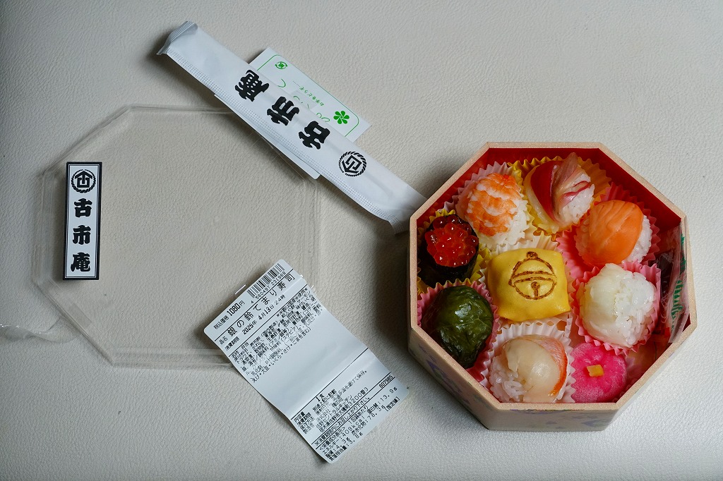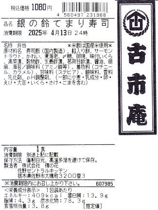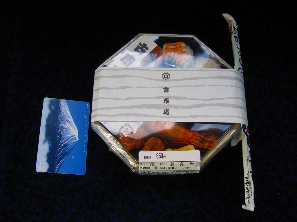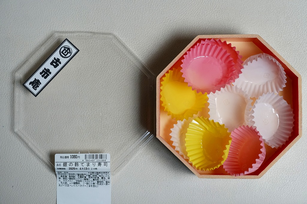 上記の駅弁「古市庵(銀の鈴てまり寿司)」の、2013(平成25)年時点での姿。2025年時点のものと、おおむね変わらない。中身やコンセプトは健在だったが、下記の2010年当時のものから、調製元が変わり、専用の紙箱や掛紙を失い、体裁はデパ地下などの惣菜弁当になってしまった。当時は容器に紙帯を巻き、食品表示上の商品名が「銀の鈴弁当」であった。