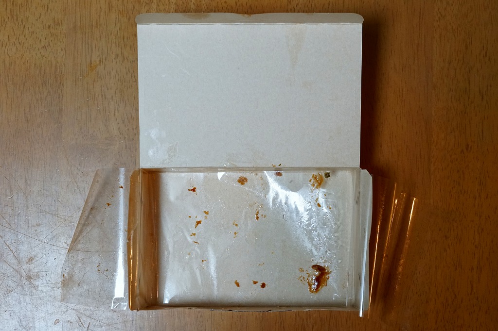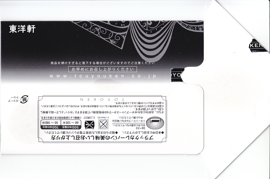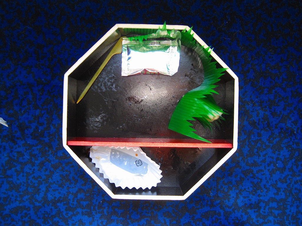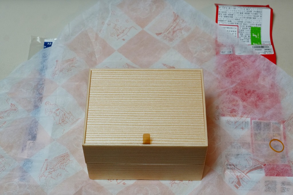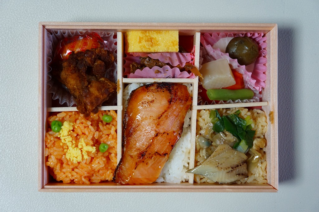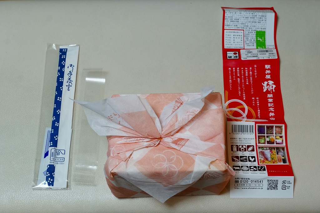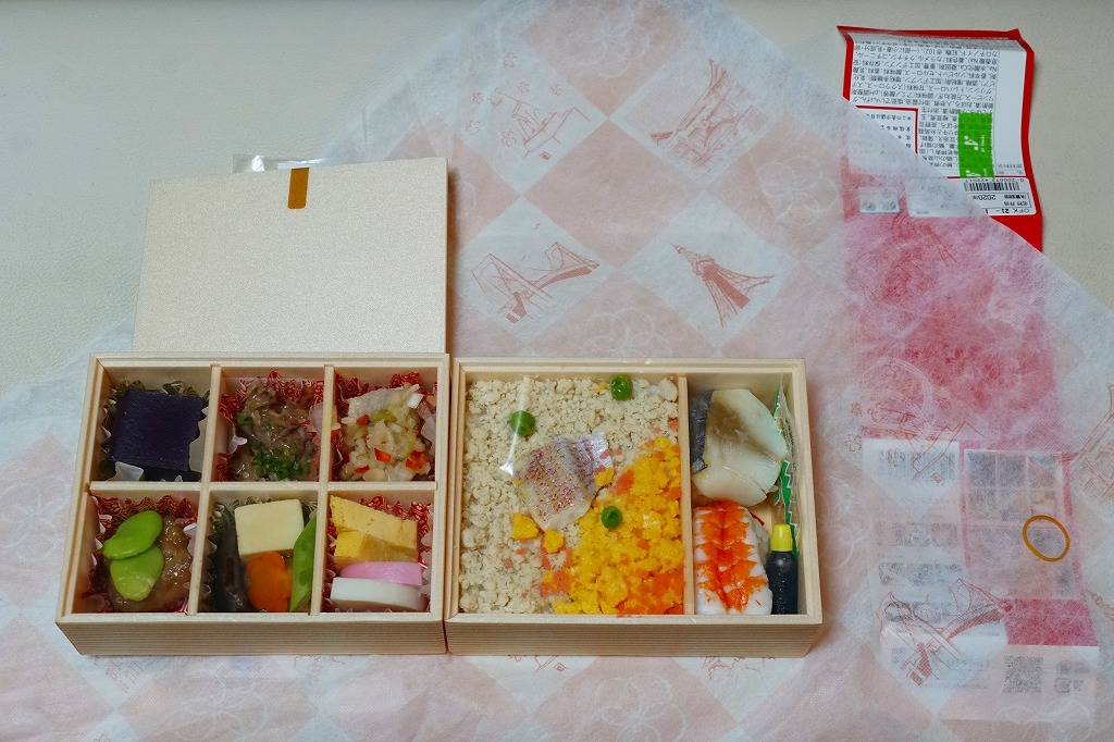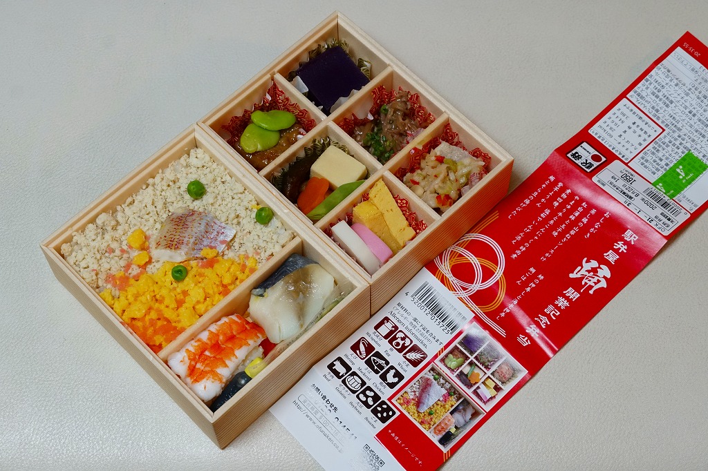 掛紙の裏側に記される中身は、10年前と少し異なり、今回は金目鯛の西京焼、牛肉と玉ねぎのオイスターソース炒め、ひじき煮、蒲鉾、玉子焼、煮物、海鮮ちらし寿し、しらすご飯、香の物、甘味。中身は内容に加えて、その見た目も異なるので、復刻という感じはしない。ちらしずしの色彩でお祭り気分を感じられるかどうかの、普通のお弁当に見えた。