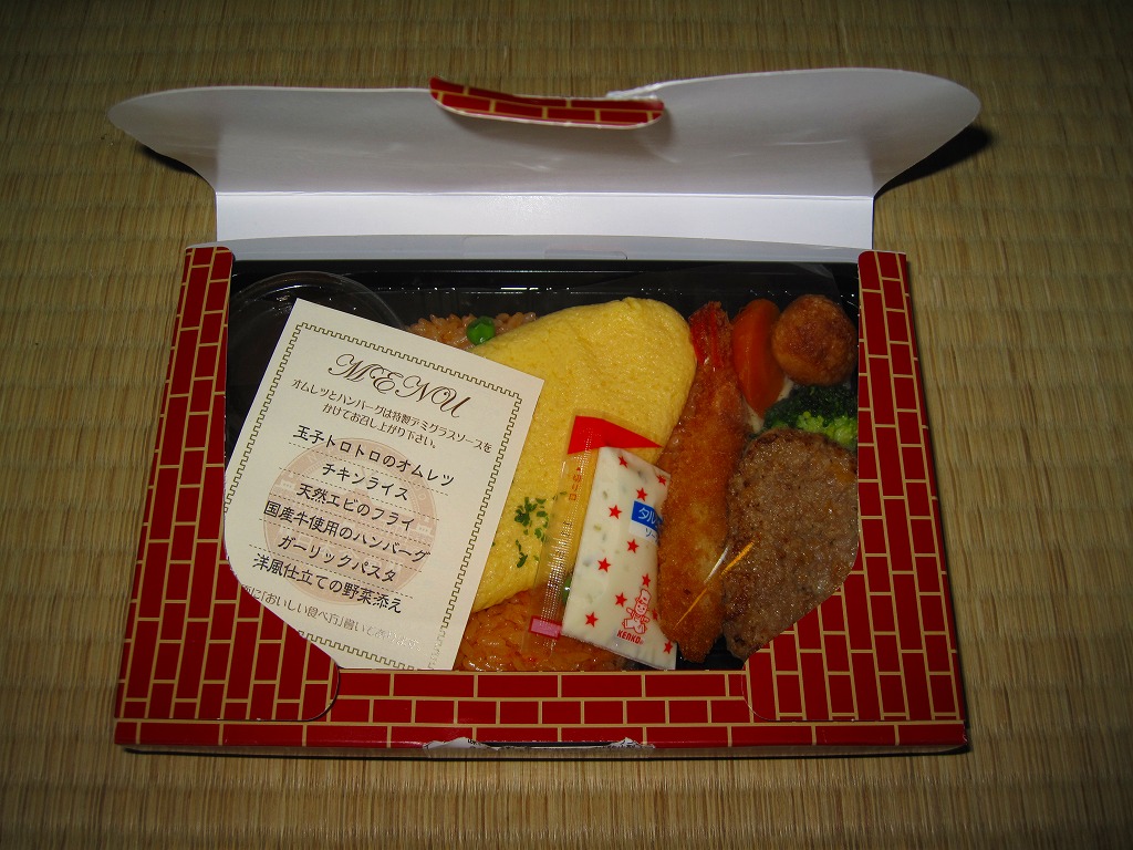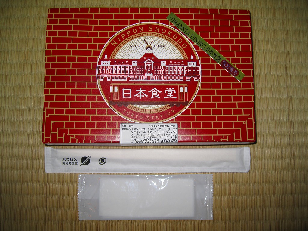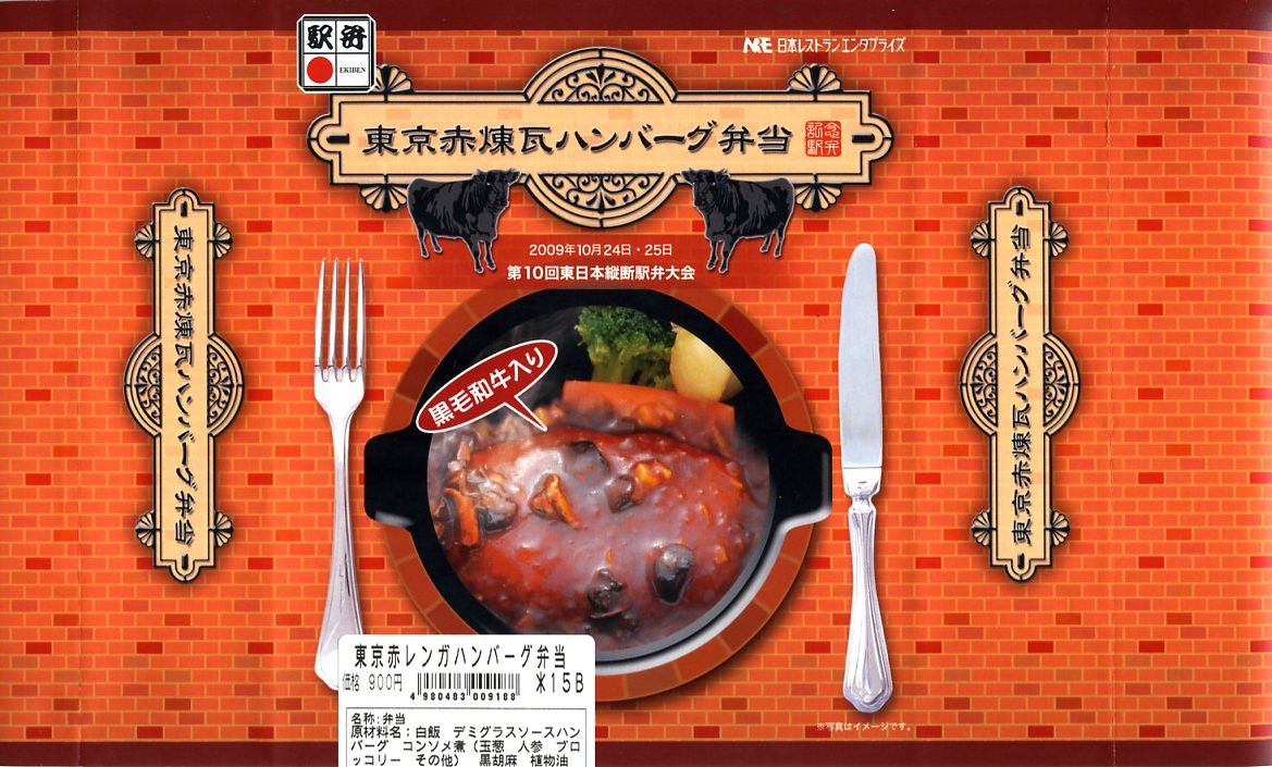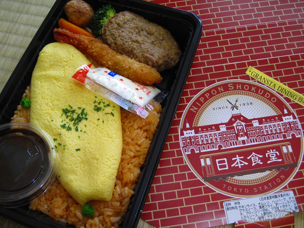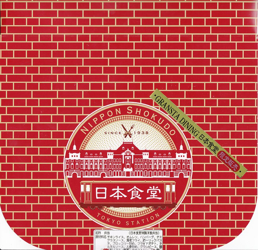 東北新幹線新青森開業に合わせて2010(平成22)年12月4日に開業した、東京駅構内食品街「グランスタダイニング」内のレストラン「日本食堂」で販売された洋食弁当。赤レンガ柄のボール紙製容器を使用、黒いプラ製トレーに収まる中身は、チキンライスにオムレツを載せ、ハンバーグ、エビフライとタルタルソース、パスタとニンジンとジャガイモとブロッコリー、デミグラスソースを添えるもの。和風洋食が完璧に体現されているうえ、冷めても食べられる味に仕上がっている。高価だが東京の味として、食べて旅の記念になる。駅構内工事を理由に食品街の全店舗が閉店したため、2016(平成28)年2月限りで終売。