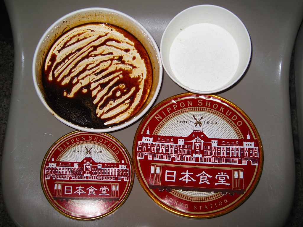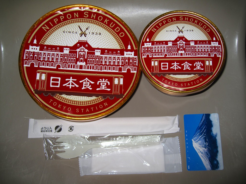 東北新幹線新青森開業に合わせて2010(平成22)年12月4日に開業した、東京駅構内食品街「グランスタダイニング」内のレストラン「日本食堂」で販売されたテイクアウトメニュー。そのレストランのロゴマークを印刷した大小2個の紙カップが、同柄の紙袋に収まる。中身は小カップが白御飯、大カップがデミグラスソースにハンバーグとジャガイモとニンジンとブロッコリーを漬けたもの。