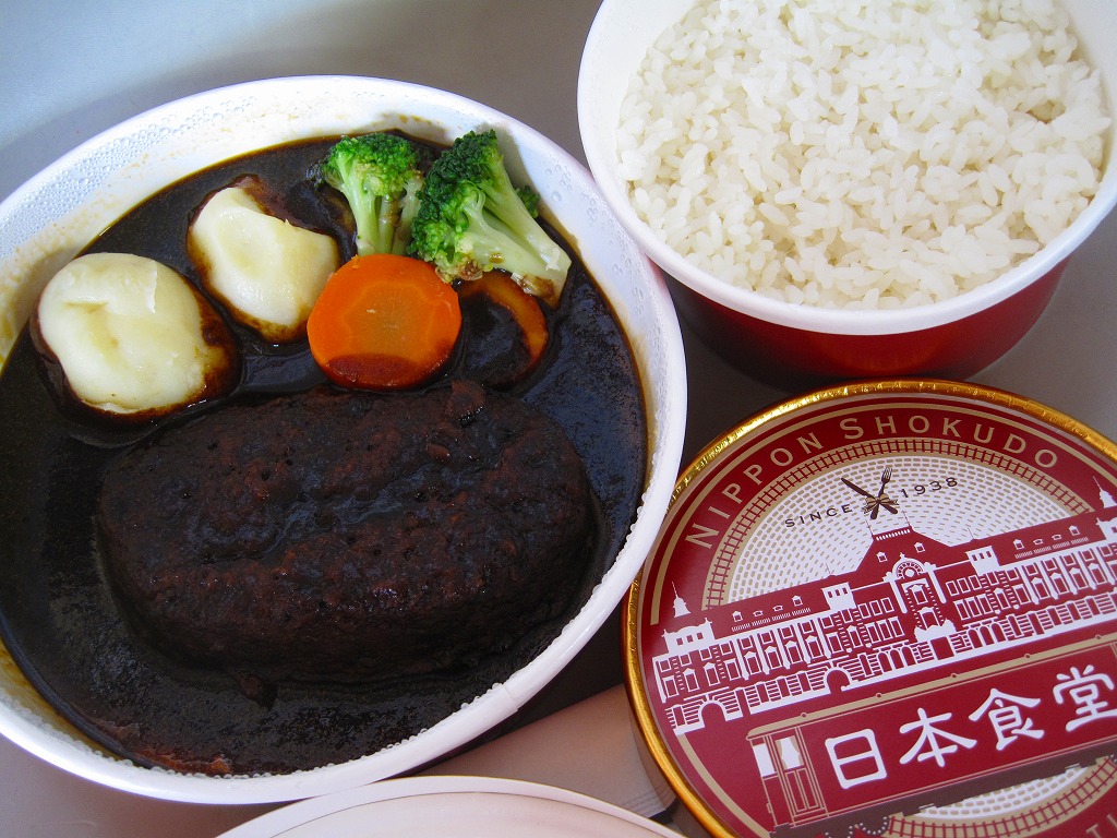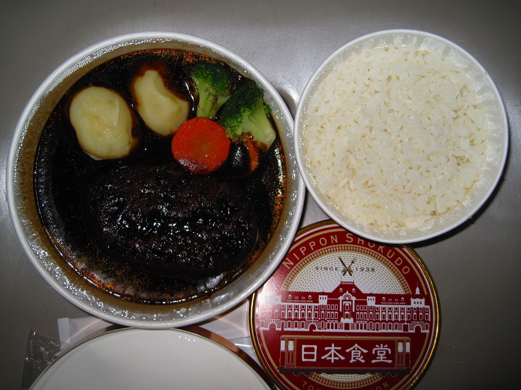 うまいものである。ただ、メインの煮込みハンバーグは、常温で食べると油がきつい感じがするので、注文販売の温かいうちに食べたほうがよいと思った。レストランではサラダ付き1,900円でメニューに載っている。なお、このメニューはここの自慢料理らしいが、平成時代の新幹線やブルートレインの食堂車にハンバーグステーキこそあれ、煮込みハンバーグというメニューを思い出せない。昭和の頃にはあったのだろうか。駅構内工事を理由に食品街の全店舗が閉店したため、2016(平成28)年2月限りで終売。