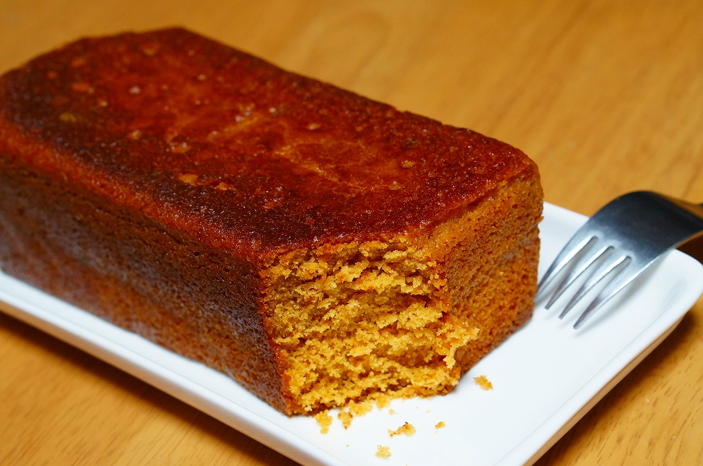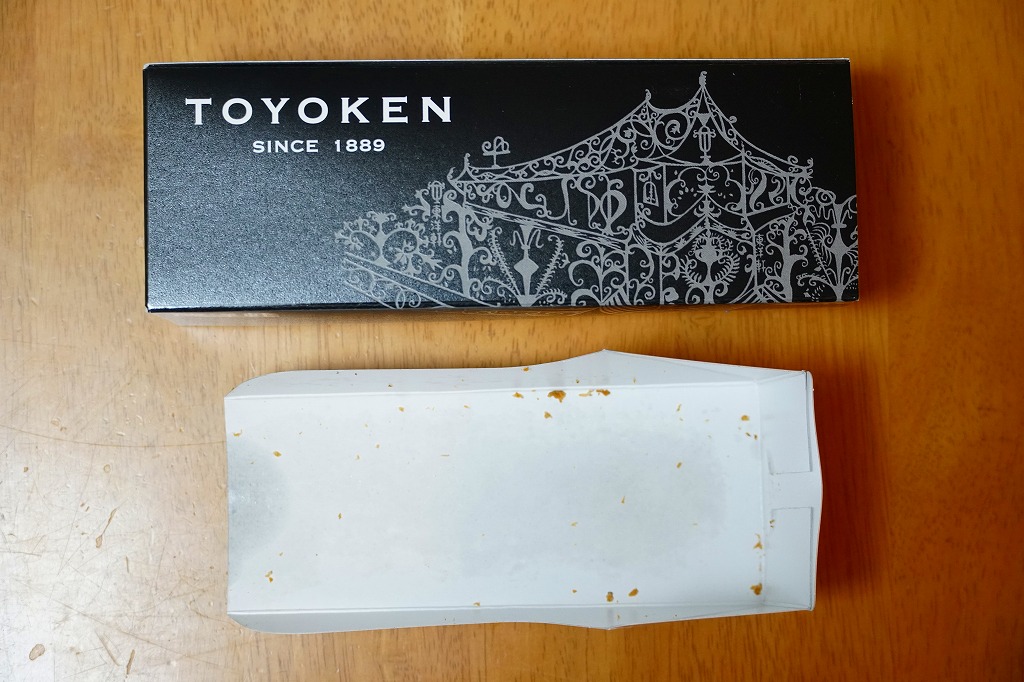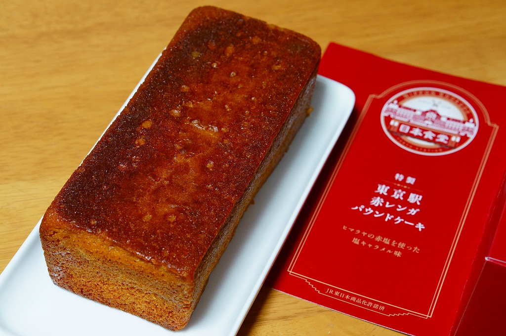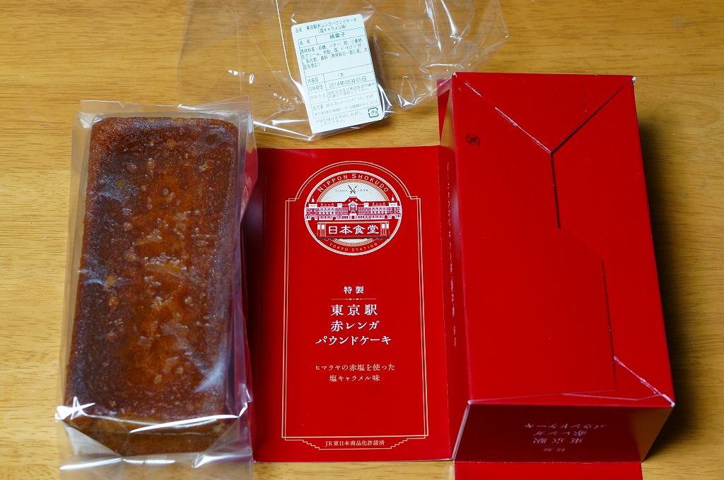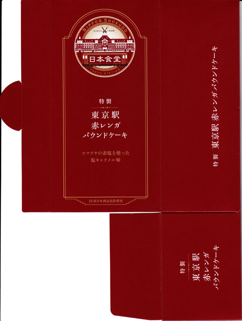 東北新幹線新青森開業に合わせて2010(平成22)年12月4日に開業した、東京駅構内食品街「グランスタダイニング」内のレストラン「日本食堂」で販売された土産品。そのレストランのロゴマークを印刷した紙箱に、ラップで密封したパウンドケーキを1本のみを収める。