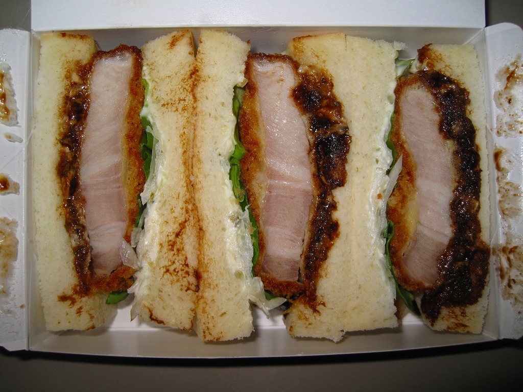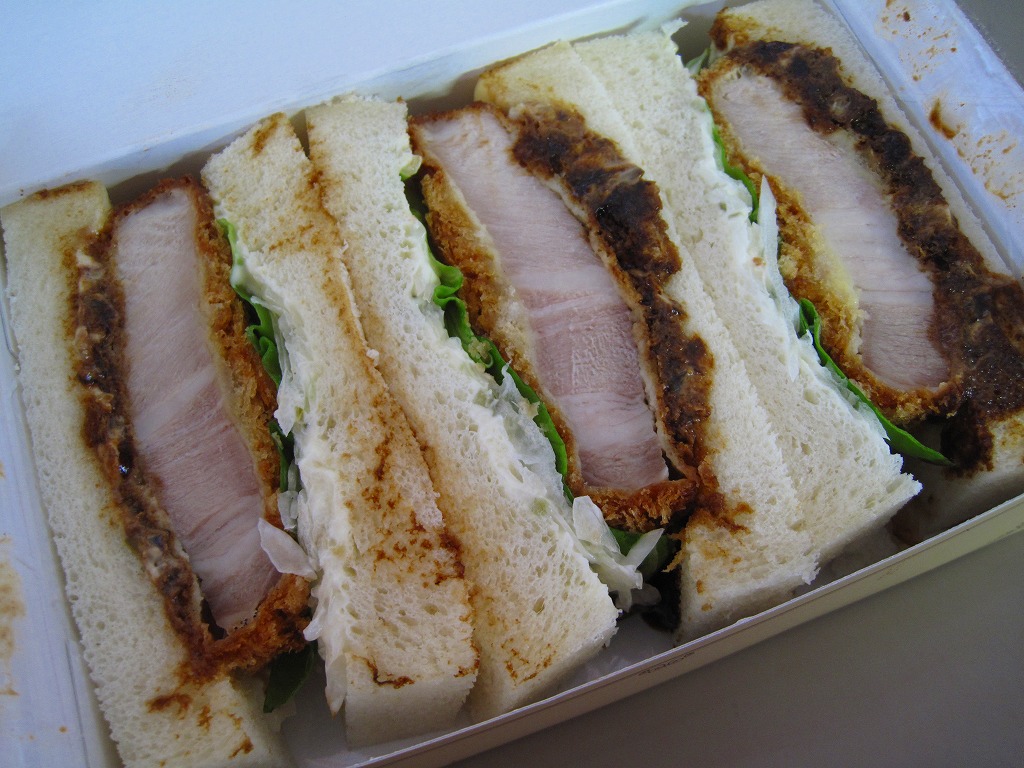 東北新幹線新青森開業に合わせて2010(平成22)年12月4日に開業した、東京駅構内食品街「グランスタダイニング」内のレストラン「日本食堂」で販売されたカツサンド。そのレストランと同じ雰囲気のデザインを持つ紙箱に、ロースカツにサラダ菜とタマネギとピクルスを合わせてマヨネーズとデミグラスソースをたっぷり塗ったカツサンドが3切れ収まる。