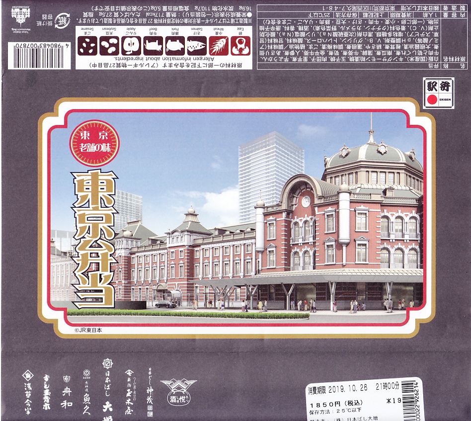 2019(令和元)年10月26日に購入した、東京駅弁の掛紙。この駅弁「東京弁当」の概要は2002年の発売時から変わらない。中身が時々少し変わり、その度に掛紙の絵柄が変わる。2019年10月1日のリニューアルで、旧東京郵便局側、商業施設「KITTE」側から見た、青空に映える東京駅丸の内復原駅舎の絵柄になった。容器もいつしか、黒から茶色に変化。この前回は2006年7月のリニューアルだった。