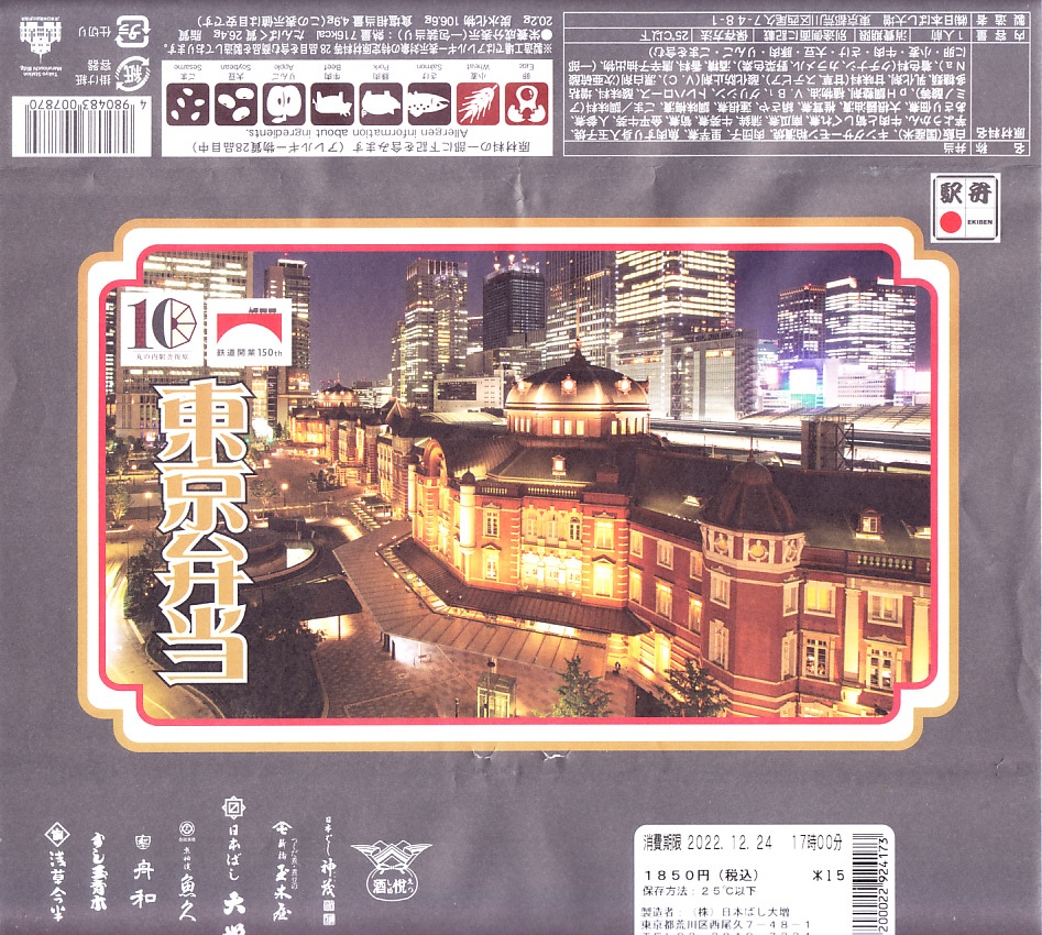2022(令和4)年12月24日に購入した、東京駅弁の掛紙。この駅弁「東京弁当」の概要は2002年の発売時から変わらない。中身が時々少し変わり、掛紙の絵柄が変わる。旧東京郵便局側、商業施設「KITTE」側から少し見下ろした、東京駅丸の内復原駅舎の夜景になった。中身は下記の2019年のものと同じ。焼鮭は人形町魚久のキングサーモン京粕漬、煮物は浅草今半の牛肉たけのこ、玉子焼はすし玉青木、蒲鉾は日本ばし神茂、芋ようかんは舟和、つぼ漬は酒悦という具合に、東京都内の老舗店の食材を詰めていた。