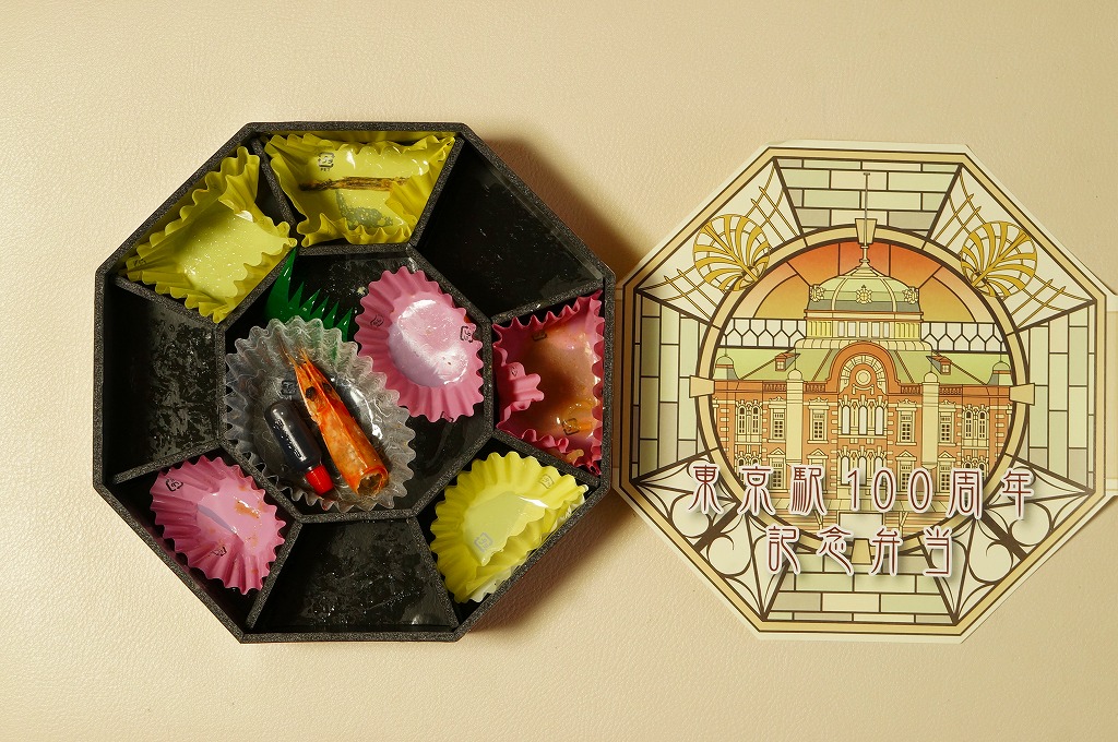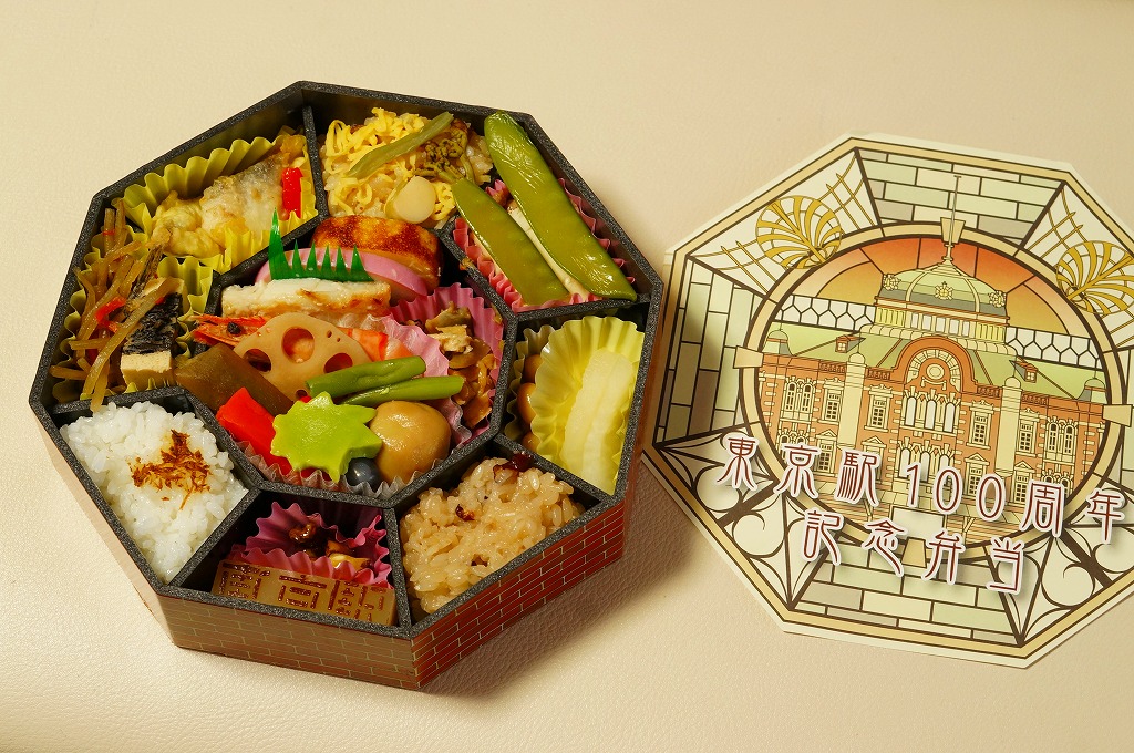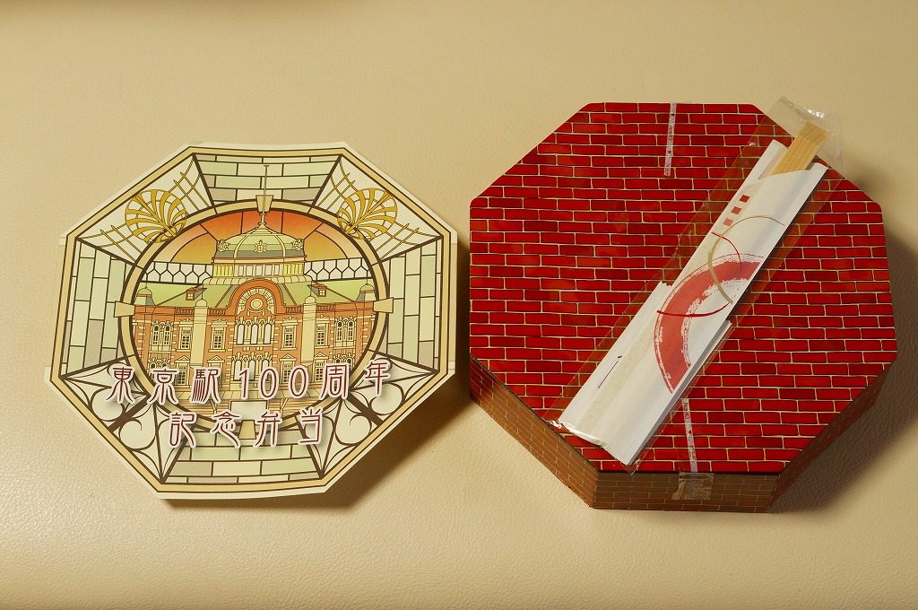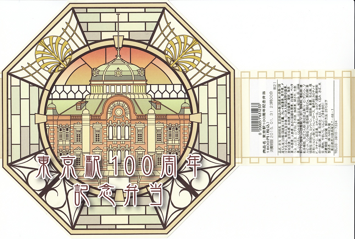 駅弁の名前のとおり、東京駅の開業100周年を記念して、2014(平成26)年10月11日から翌2015年1月31日まで販売。正八角形の容器はおそらく東京駅丸の内駅舎のドームの平面形状に合わせたのではないかと思う。この記念事業で使われた、東京駅員が作成したという絵柄をふたとした。