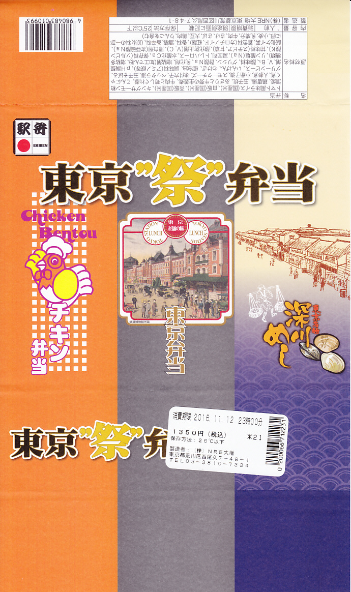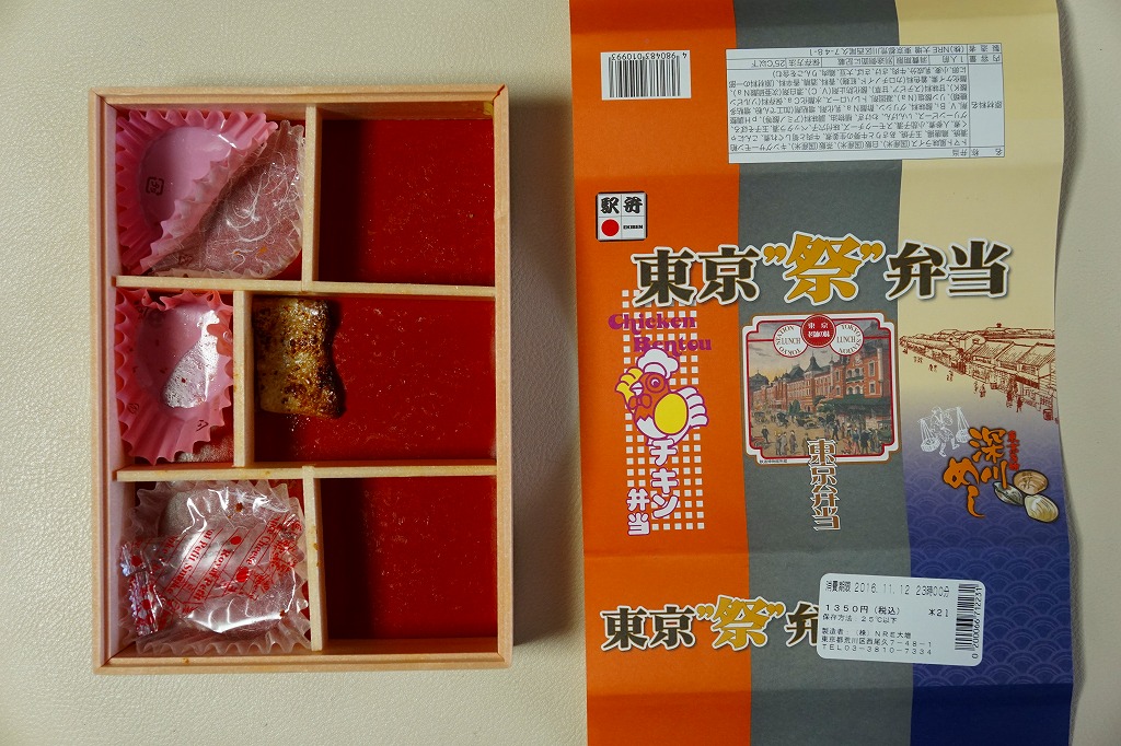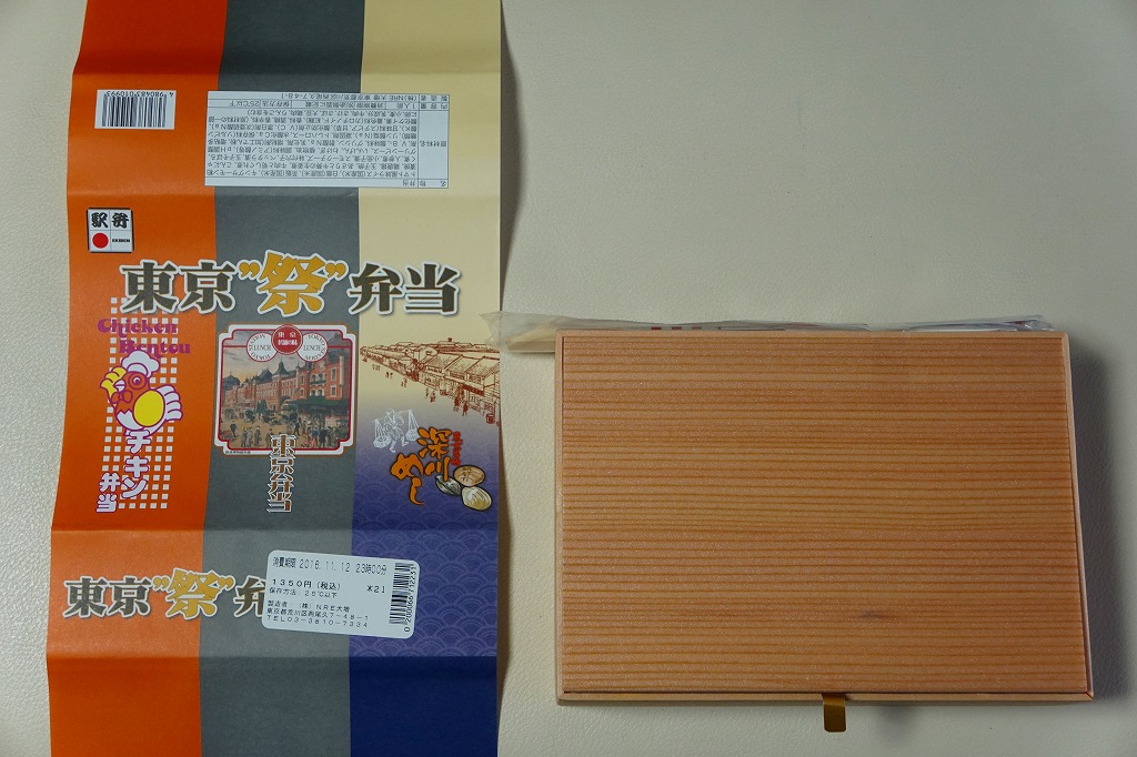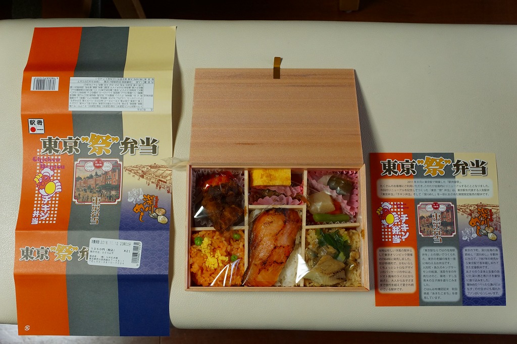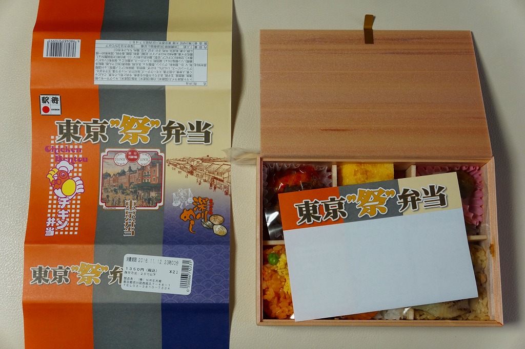 東京駅の駅弁売店「駅弁屋 祭」のリニューアルオープンを記念して、開店日の2016(平成28)年11月9日から30日まで販売。掛紙に描かれるとおり、東京駅の名物駅弁「チキン弁当」「東京弁当」「深川めし」の詰合せ。チキン弁当はチキンライスと鶏唐揚とスモークチーズ、東京弁当は白飯と焼鮭と牛肉煮と玉子焼、深川めしは茶飯にアサリとアナゴとわけぎと煮物という具合に、それぞれの駅弁の特徴が完璧に詰められていた。