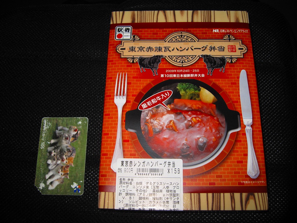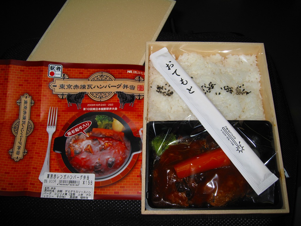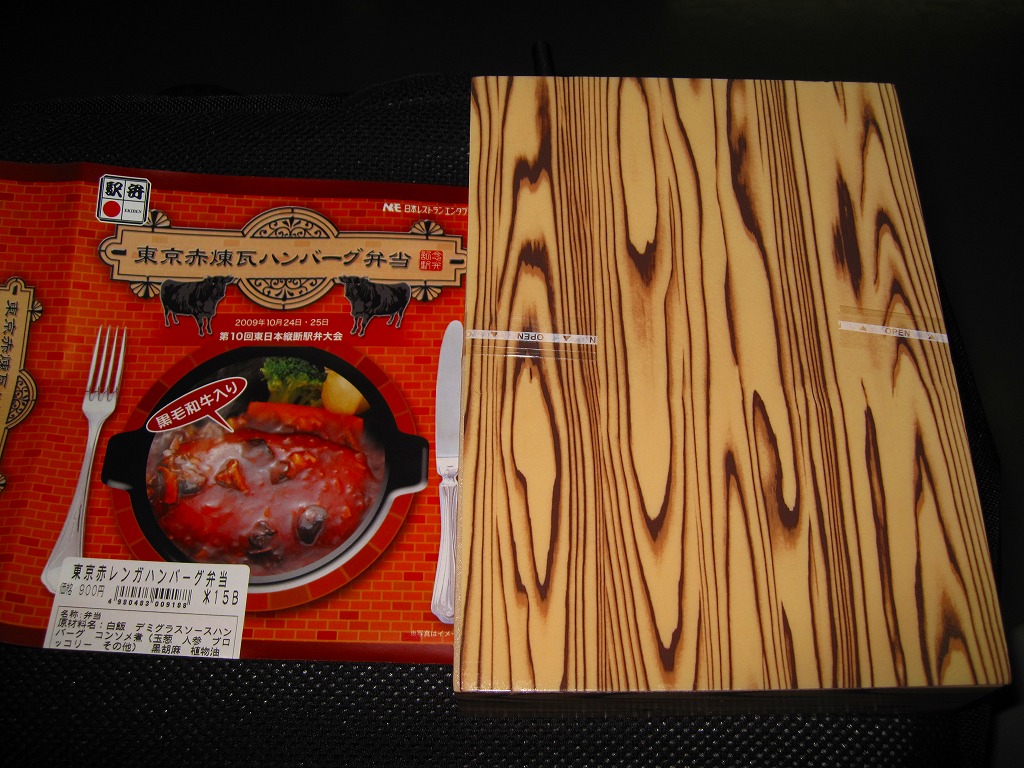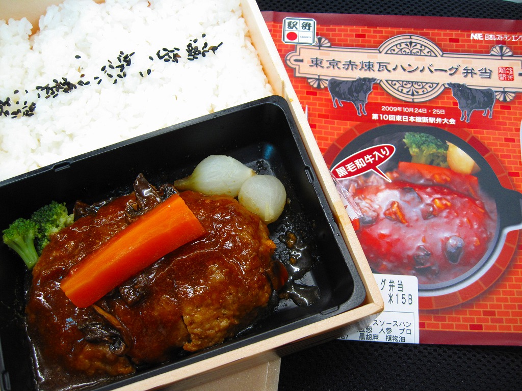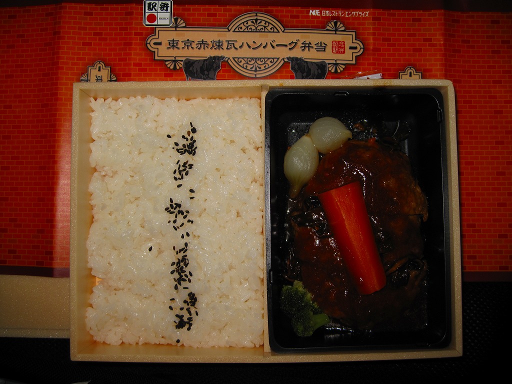 2009(平成21)年10月24・25日に東京駅構内で開催された「第10回東日本縦断駅弁大会」で販売された記念駅弁。木目を焼いた絵柄の容器をセロハンテープで留め、赤煉瓦を背景に中身の写真を載せた掛紙を巻いて、食品表示ラベルとセロハンテープで留める。中身は白御飯、ハンバーグ、ニンジン、ラッキョウ、ブロッコリーだけが入るシンプルさ。