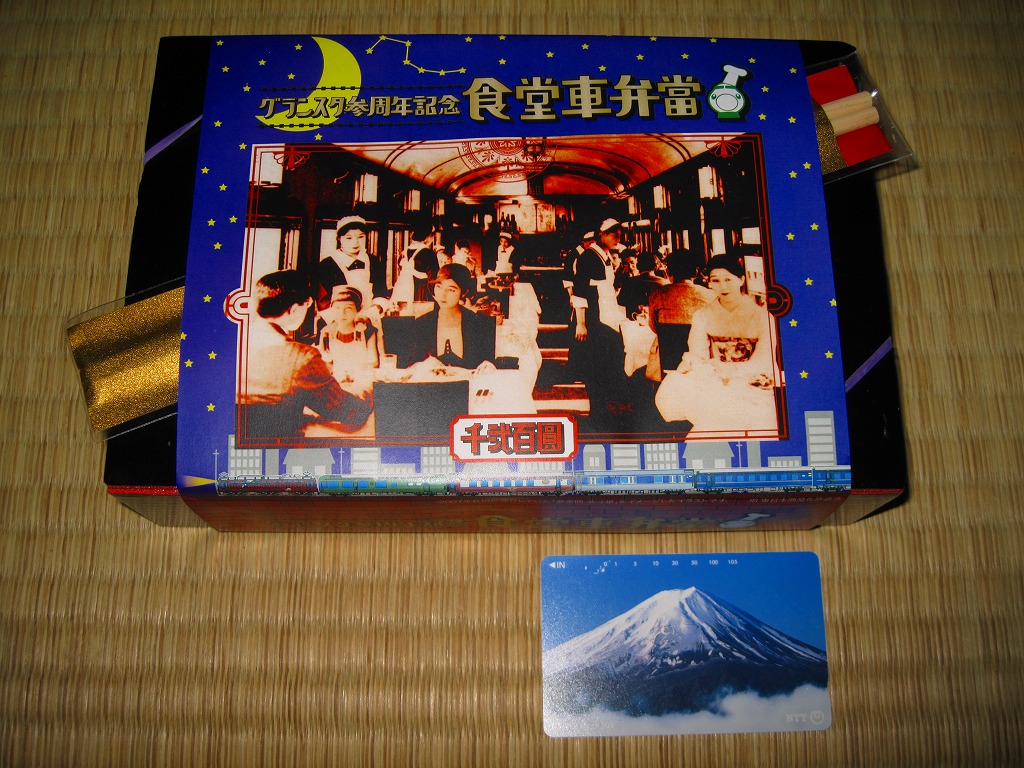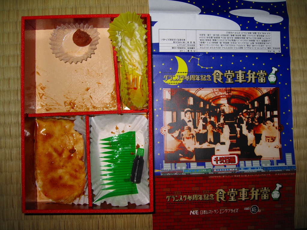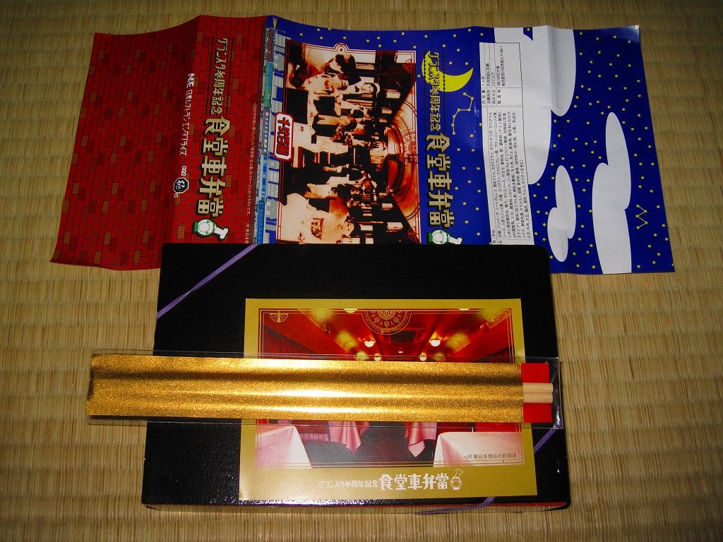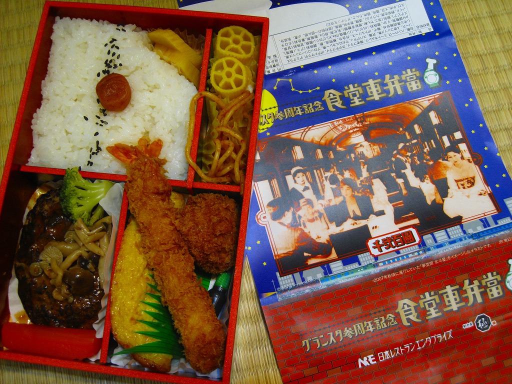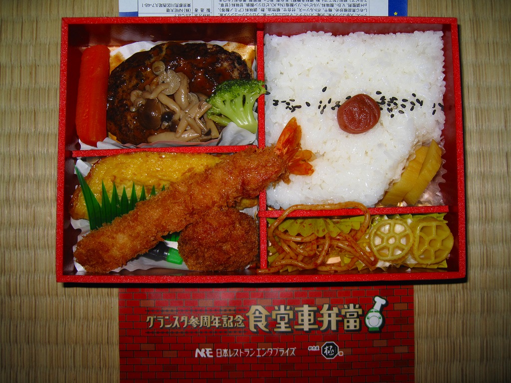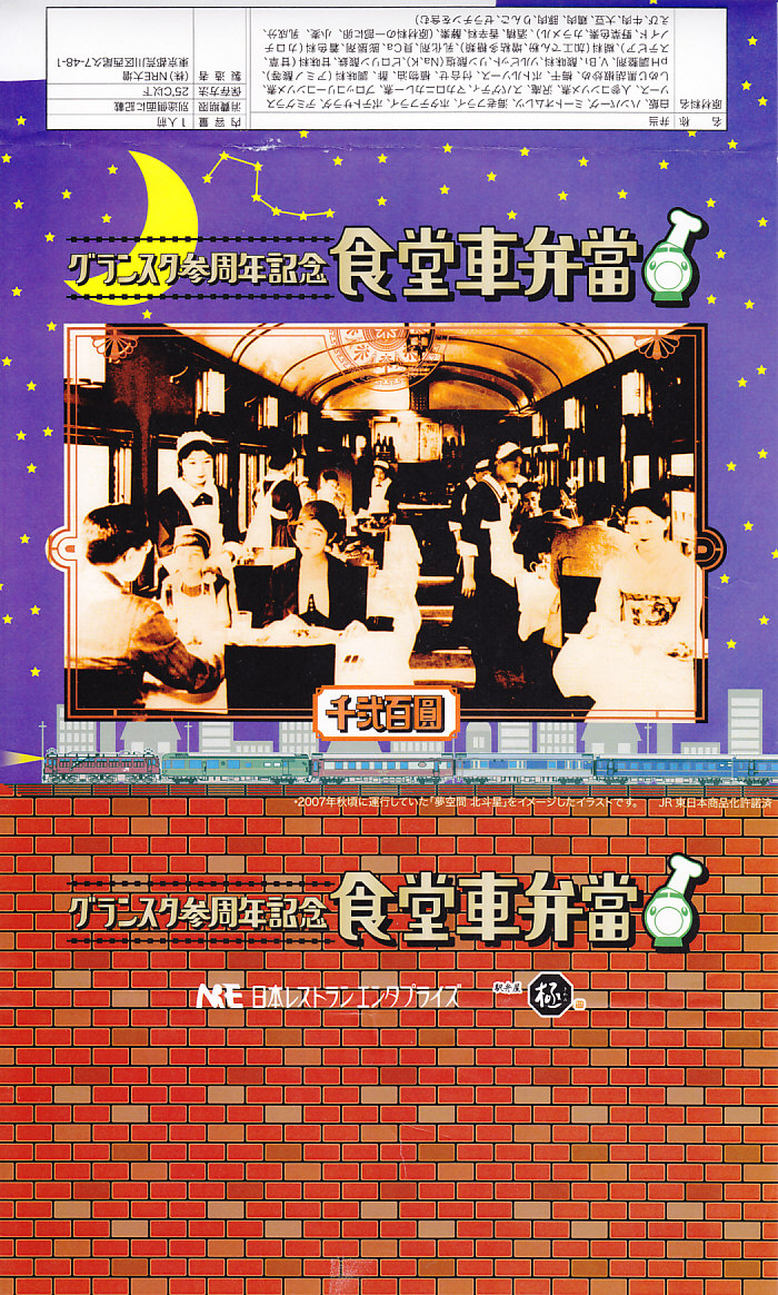 商品名のとおり、東京駅の商業施設「グランスタ」の3周年を記念して、2010(平成22)年11月前後に同施設内の駅弁売店「駅弁屋 極」で販売されたお弁当。黒塗りの長方形の発泡材容器に、食堂車内を撮影した絵はがきと金色の袋に入った割りばしを置き、昔の食堂車内の写真を印刷した掛紙を巻く。中身は日の丸御飯にハンバーグ、エビフライ、ホタテフライ、肉入りオムレツ、スパゲティ、マカロニ、ポテトフライなど。