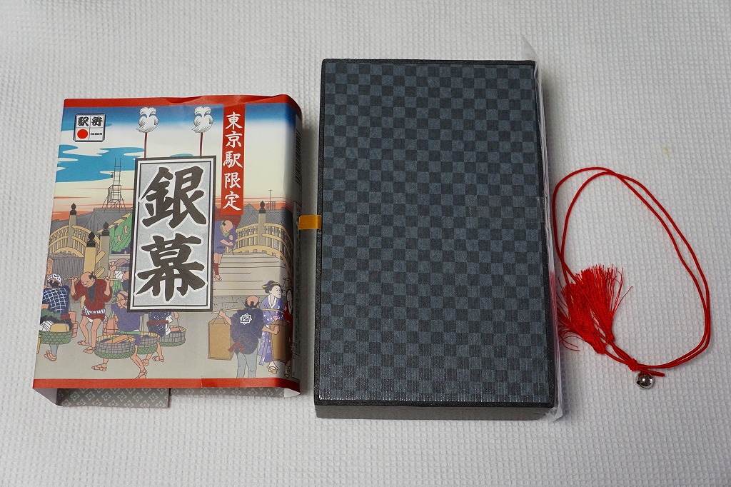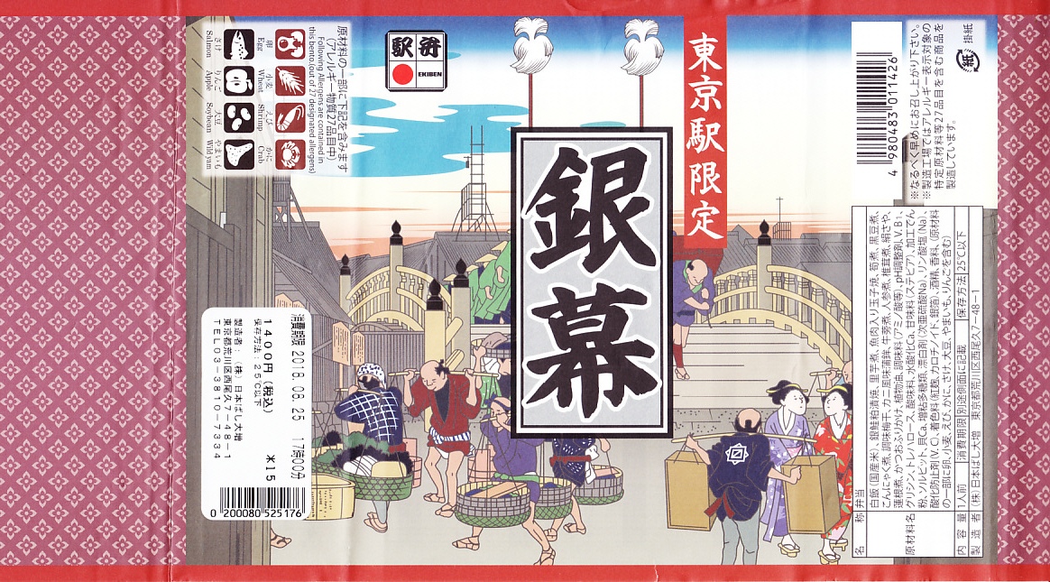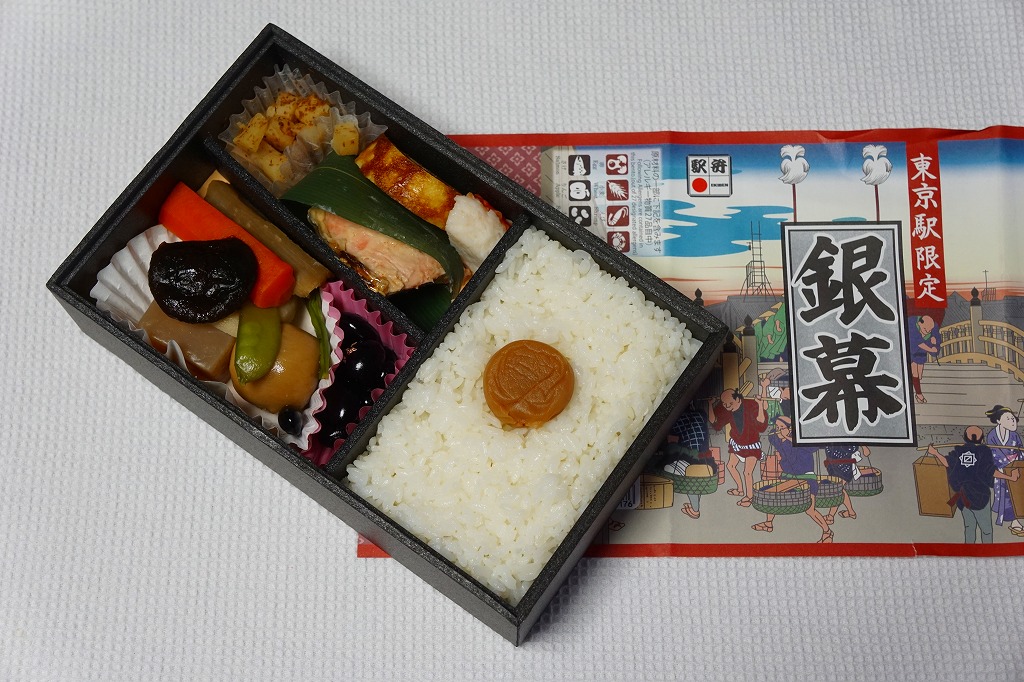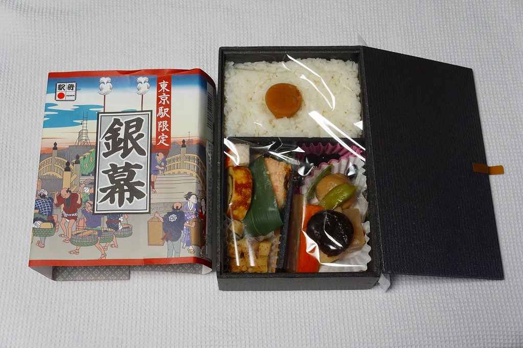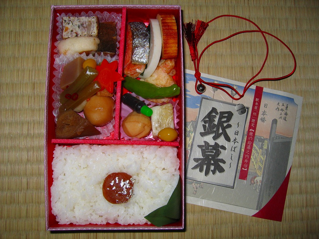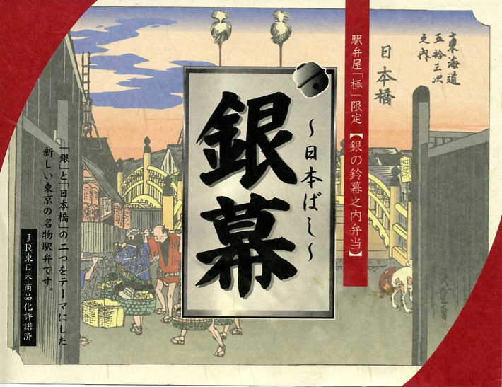 東京駅の改札内地下通路の商業開発「グランスタ」内のテナント「駅弁屋 極」のオープンに伴い、2007(平成19)年10月25日に同店限定販売駅弁として発売。駅弁の名前は「銀の鈴幕之内弁当〜日本ばし〜銀幕」とも紹介される。深さのある長方形の紙箱に銀色のふたをして食品表示ラベルを貼り、日本橋の錦絵と駅弁の名前を描いた掛紙をかけて、鈴を付けたゴムでしばる。