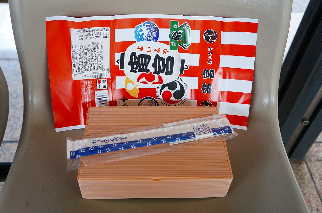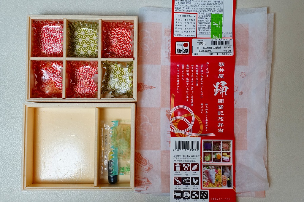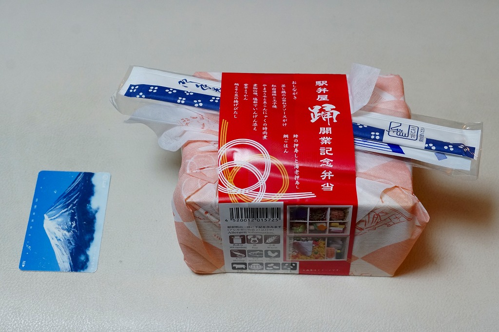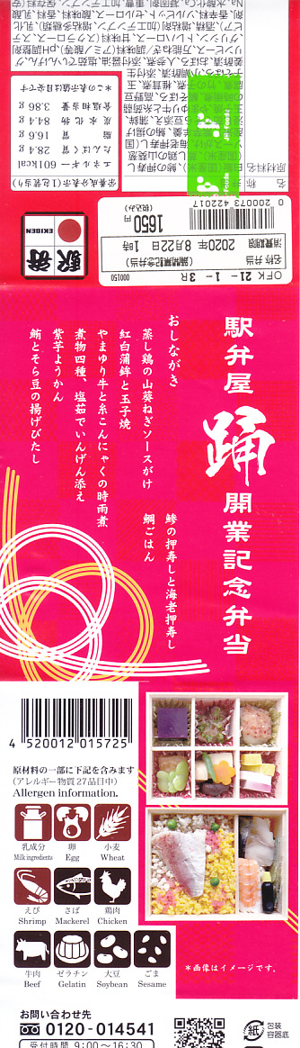 2020(令和2)年6月17日の東京駅弁売店「駅弁屋 踊」の開業を記念した弁当であることは、駅弁の名前からして明らかであるが、発売や販売は開店時でなく8月のみであった模様。中身は文字と写真で紙帯に記されるとおり、下段は鯛ごはんに鯵の押寿しと海老押寿し、上段は蒸し鶏、かまぼこ、玉子焼、牛時雨煮、煮物、ようかんなど。調製元が大船駅の駅弁屋で、もっとも今はJR東日本の孫会社として東京の駅弁を手広く調製するが、この中身には大船駅弁の要素も少し感じられた。