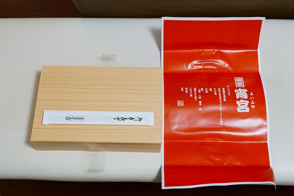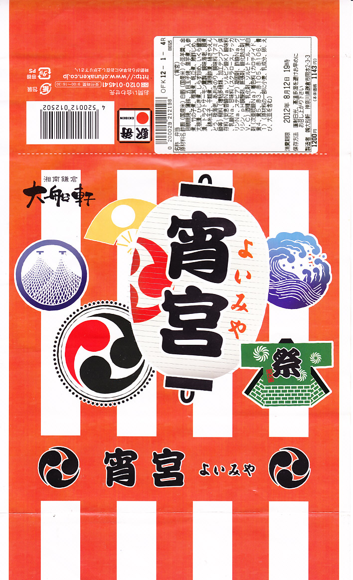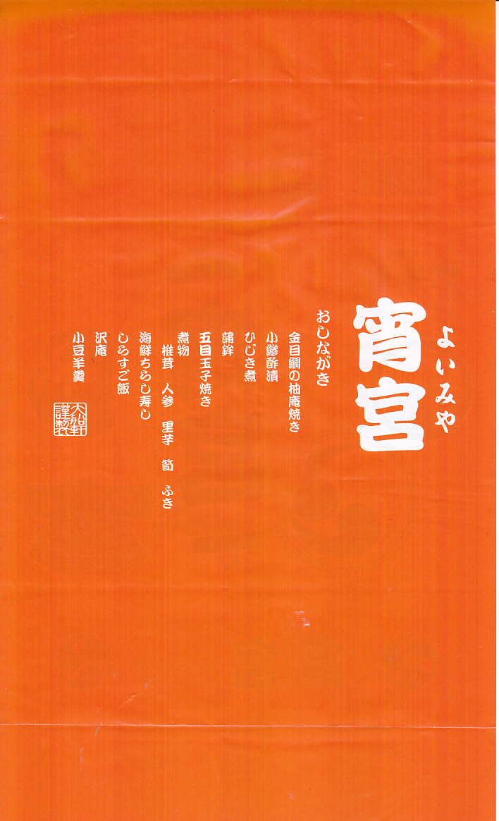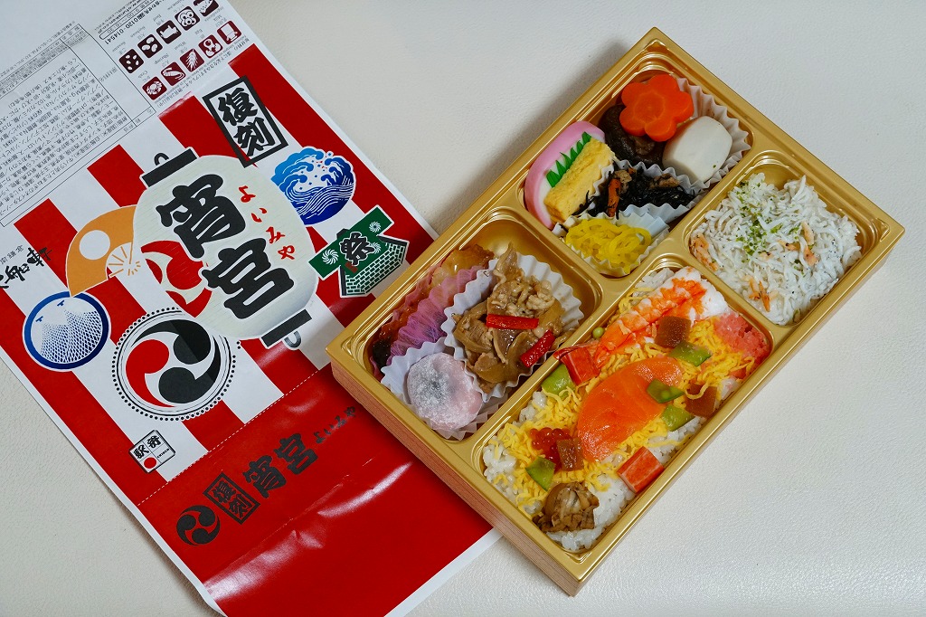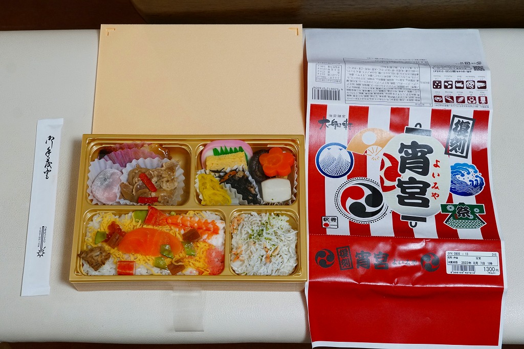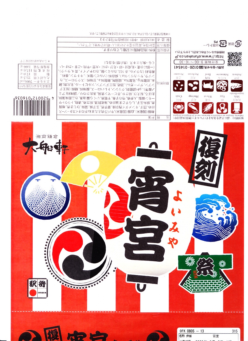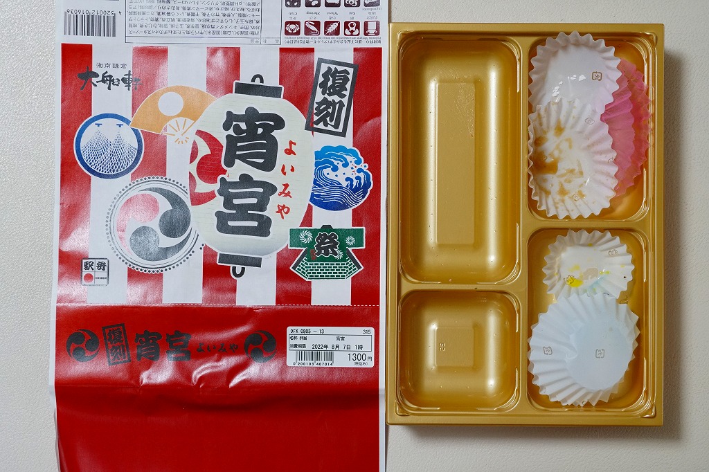 2022(令和4)年8月上旬に東京駅の駅弁売店「駅弁屋 祭」で販売か。調製元や販売元の発表や広報がないので分からないが、どうもこの駅弁売店の10周年を記念した商品のようで、10年前のリニューアルオープン時に販売した駅弁「宵宮」を復刻したものらしい。掛紙は10年前の絵柄に「復刻」と入れたものになっている。
