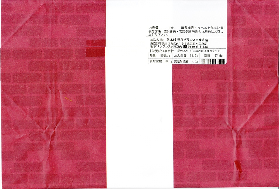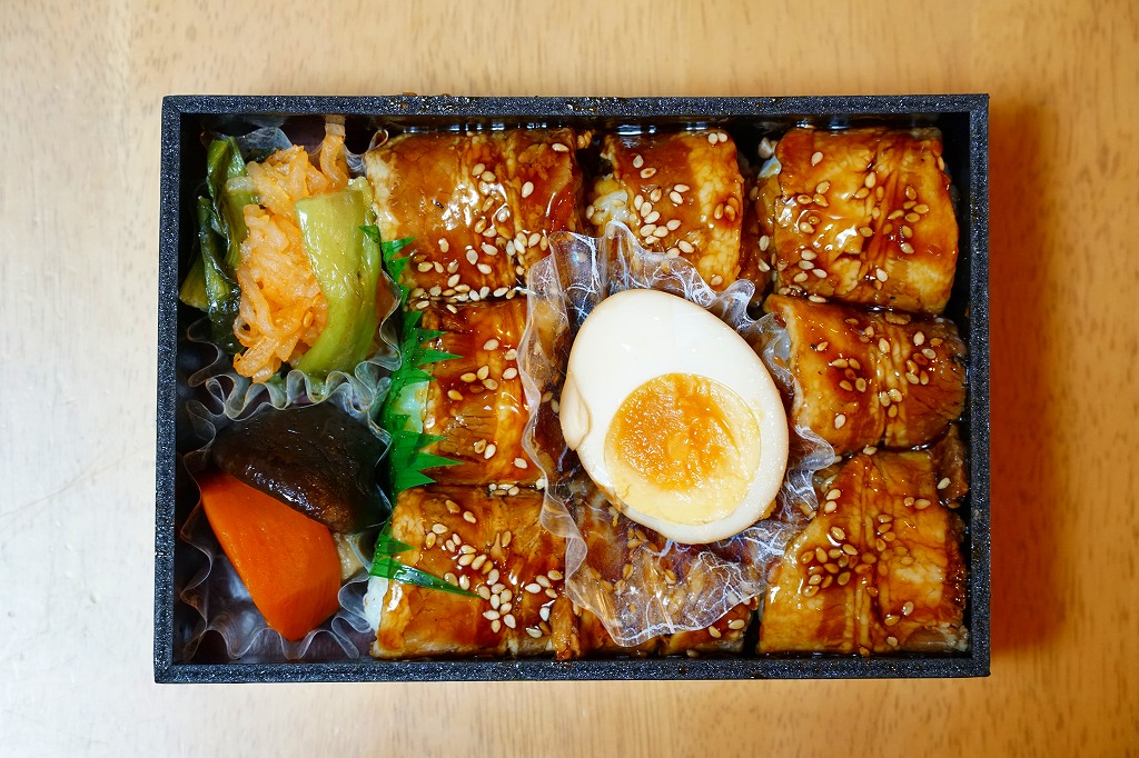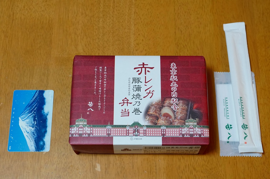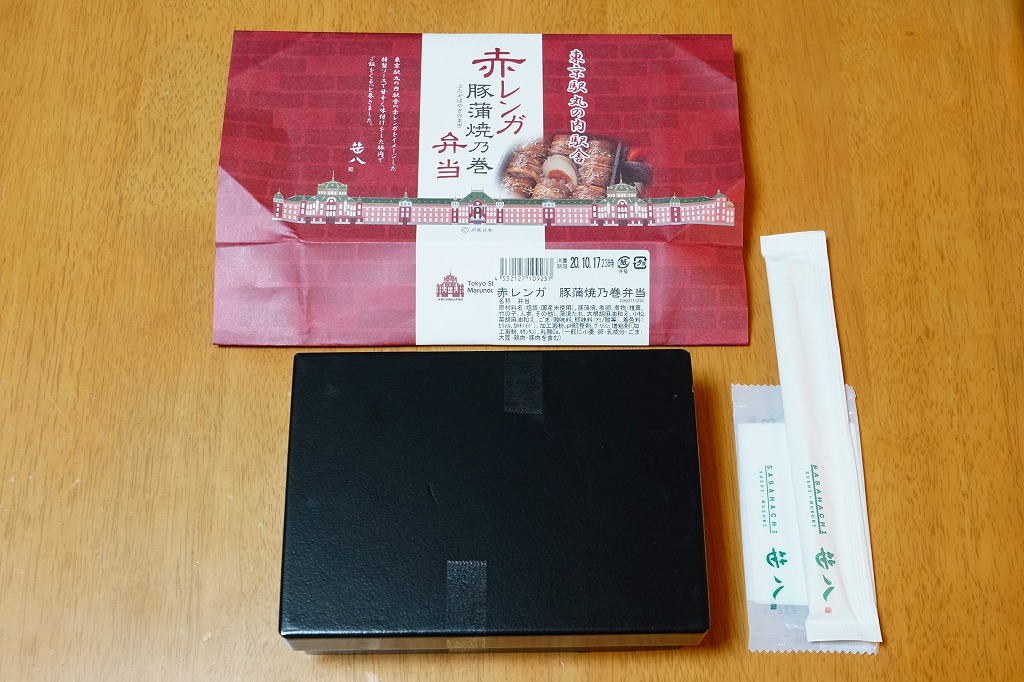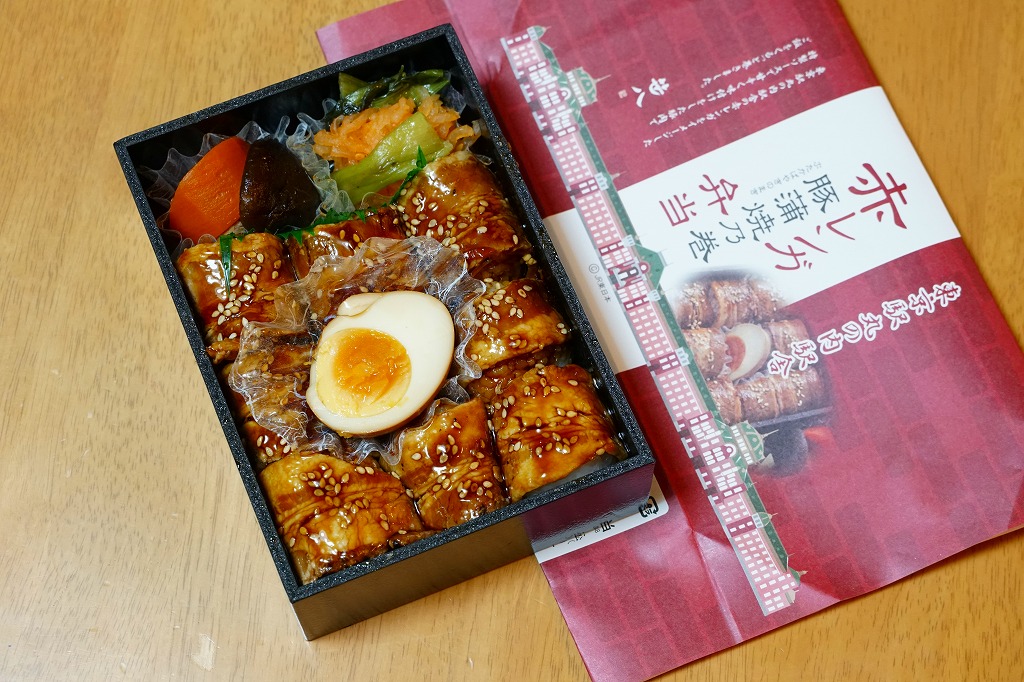白飯をタレがしたたる豚焼肉で巻いた物を8個と、半身の煮玉子、煮物、大根と小松菜の和え物を黒い折箱にはめて、赤レンガの色と絵柄を持つ包装紙に包んでいた。軽食に持て余し、一食には足りない分量感。2020年頃までの販売か。