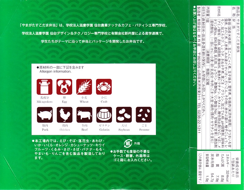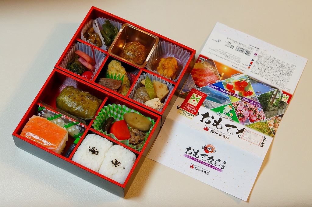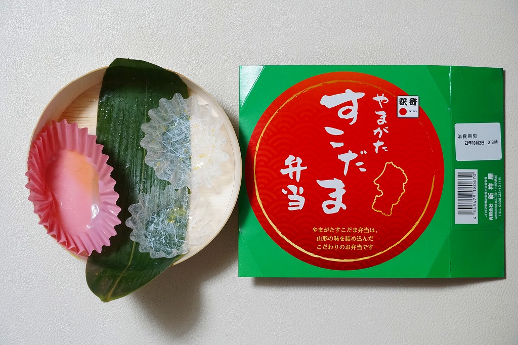 「すこだま」とは山形弁で「すごいたくさん」を意味する。箱と中身は、学校法人滋慶学園仙台農業テック&カフェ・パティシエ専門学校、学校法人滋慶学園仙台デザイン&テクノロジー専門学校と、調製元との産学連携で開発したという。そんな緑地で日の丸のスリーブに「山形の味を詰め込んだこだわりのお弁当」と書いてある。