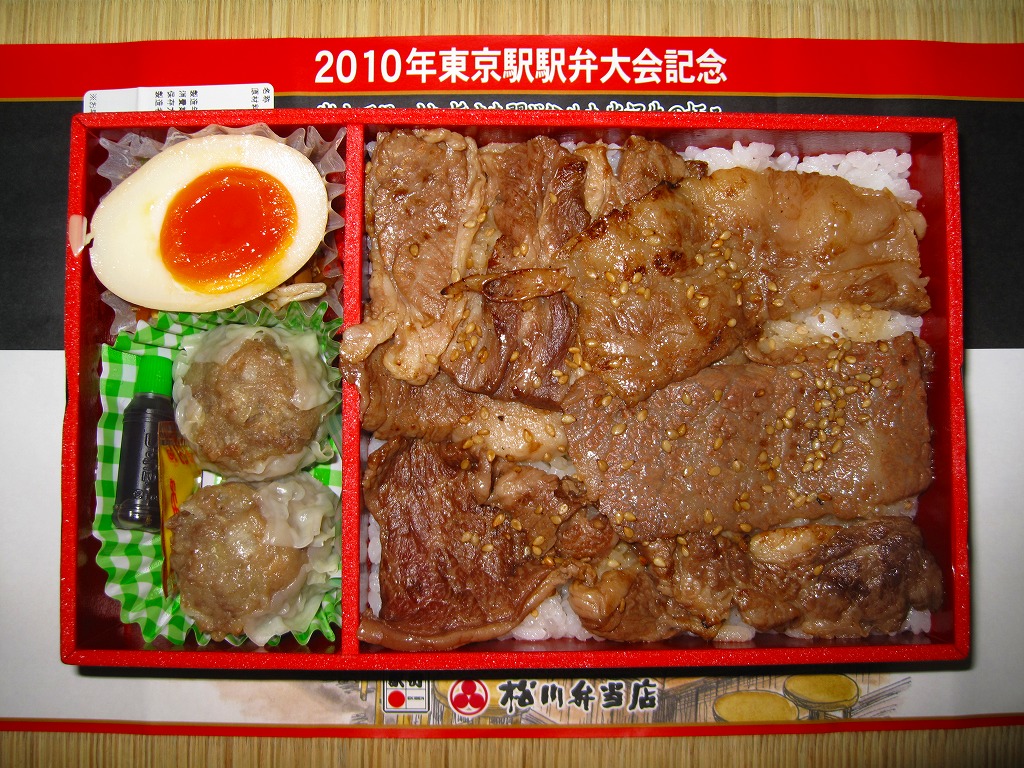 上記の駅弁「焼肉弁当 Roast meat lunch box」と同じもの。煮玉子が玉子焼になったのは、リニューアルか改修か、あるいは時節柄によるものか。いずれにせよ現存しない。