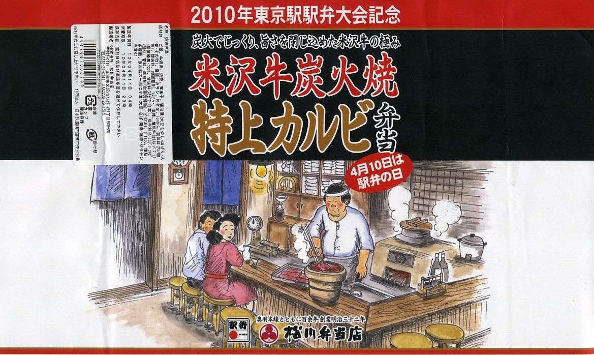 2010(平成22)年4月11日の調製である、東京駅の記念駅弁の掛紙。同日と前日に東京駅構内で開催された「駅弁の日 東日本縦断駅弁大会(春)」こと第11回東日本縦断駅弁大会で販売された。そのため「2010東京駅駅弁大会記念」や「4月10日は駅弁の日」といった記述が見られる。