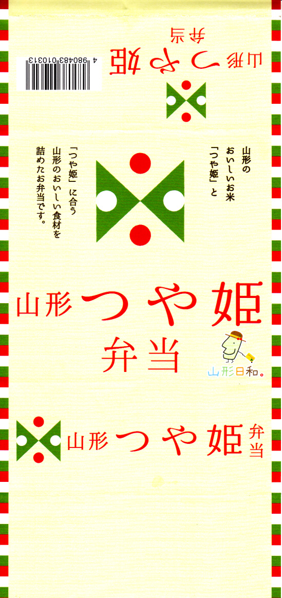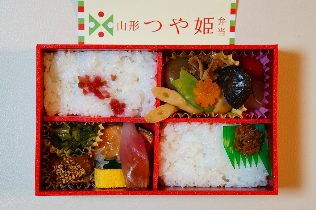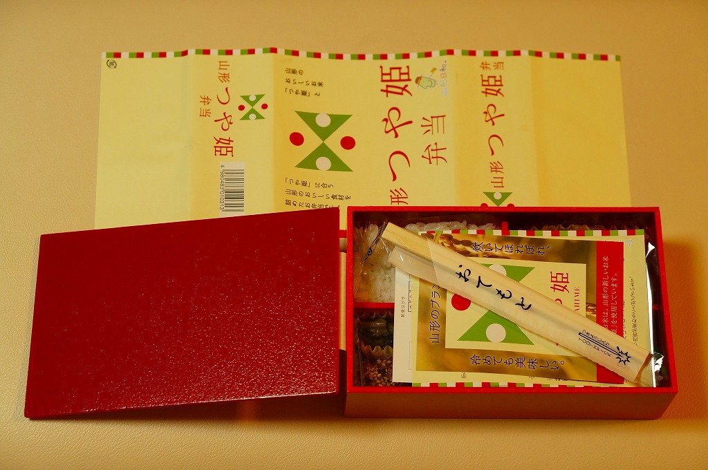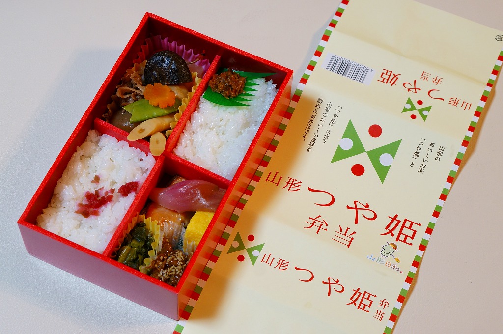 2014(平成26)年6月14日から個数限定で販売。山形のお米の名前を名乗るが、調製は東京のNRE。4つに区切った容器の2区画に真っ白な御飯を詰め、梅と味噌を添えて、もう1区画に芋煮と果物、残る1区画に焼鮭、玉子焼、みょうがなど。とても出来の良い山形キャンペーン弁当。ただ、肝心の米の味がなぜかいつものNREであり、山形駅弁「やまもり弁当」で感激した味を感じられなかった。3か月間ほどの販売か。