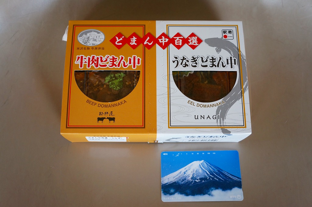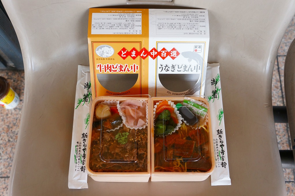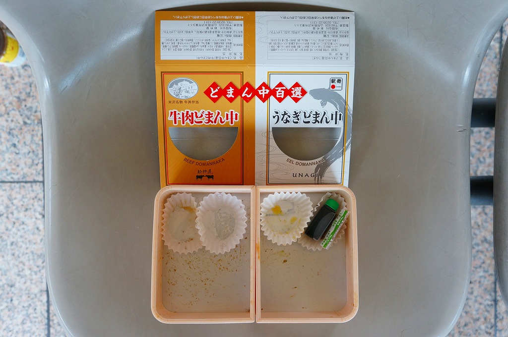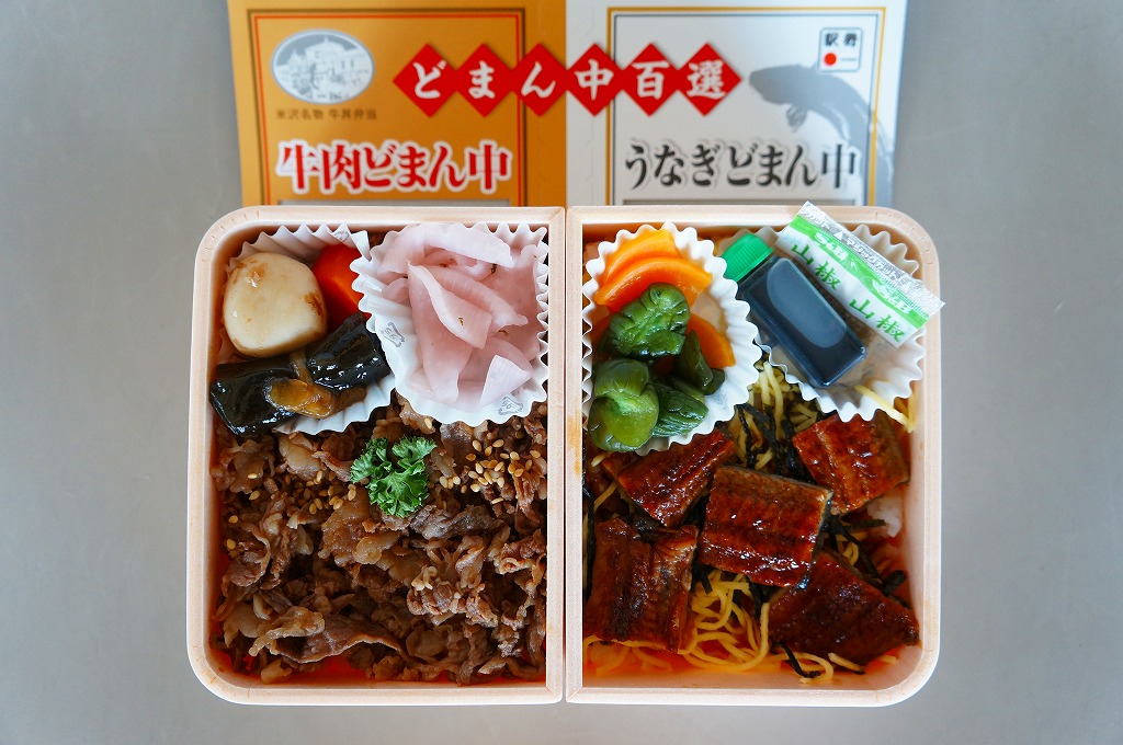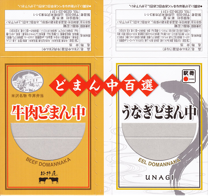 つまり、米沢駅の名物駅弁「牛肉どまん中」をハーフサイズにして、さらに「うなぎどまん中」なる部分を同じサイズでくっつけた。割り箸を2膳付けており、真ん中で千切ってふたつのミニ駅弁にすることもでき、調製表示も2枠書いてある。これはとてもユニークな試み。調製元はもちろん、「牛肉どまん中」の米沢駅の駅弁屋であるが、あくまでも東京駅限定の駅弁である。