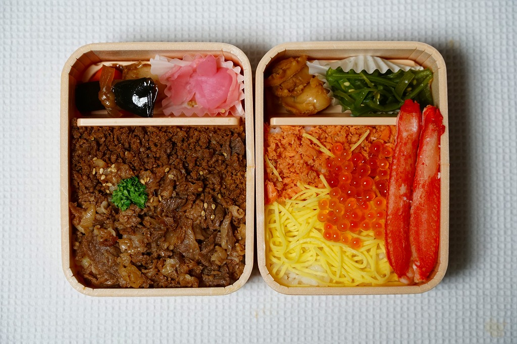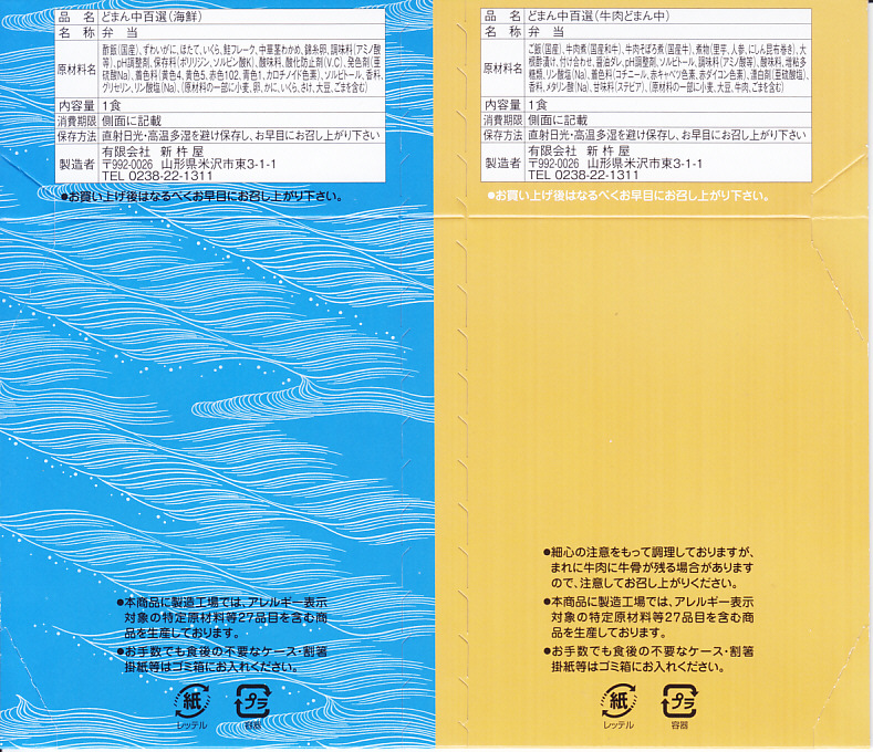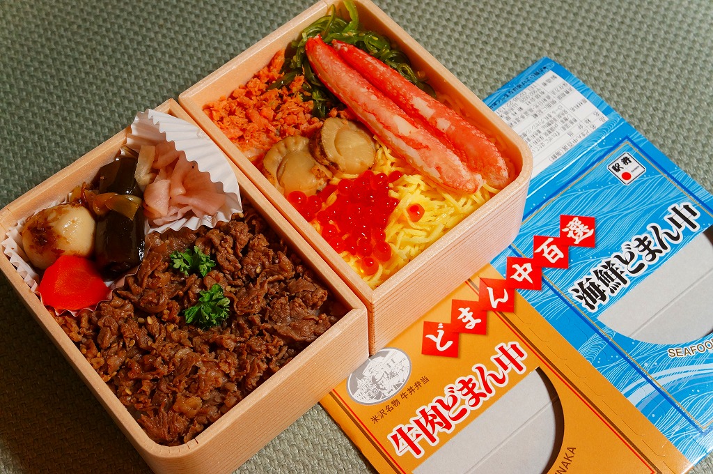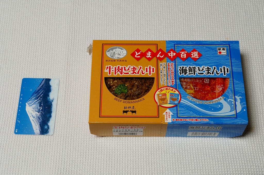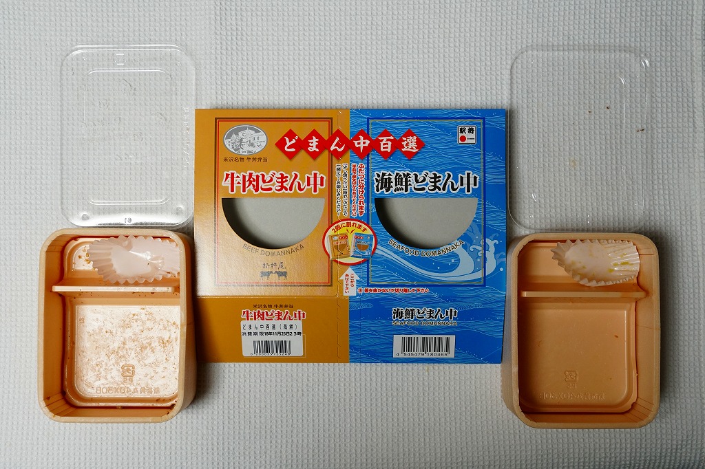 つまり、米沢駅の名物駅弁「牛肉どまん中」をハーフサイズにして、さらに「海鮮どまん中」なる部分を同じサイズでくっつけた。割り箸を2膳付けており、真ん中で千切ってふたつのミニ駅弁にすることもでき、調製表示も2枠書いてある。これはとてもユニークな試み。調製元はもちろん、「牛肉どまん中」の米沢駅の駅弁屋であるが、あくまでも東京駅限定の駅弁である。このシリーズは不定期での販売に見える。