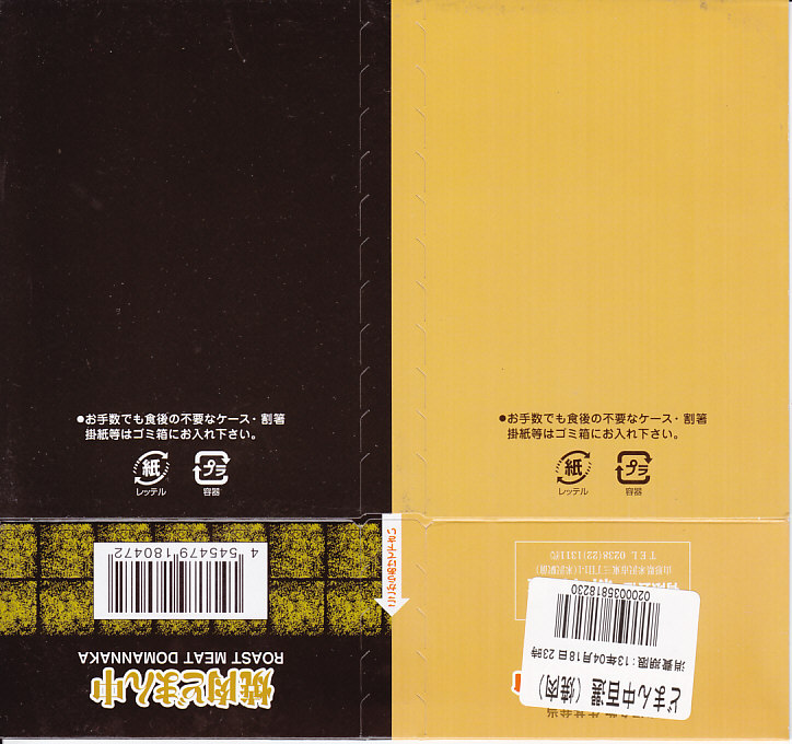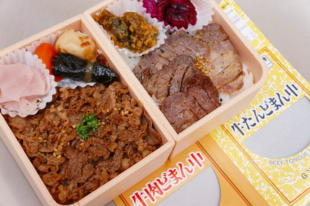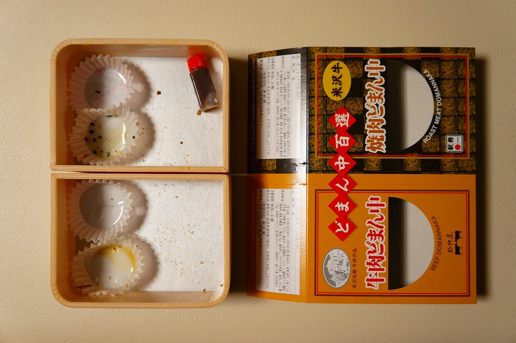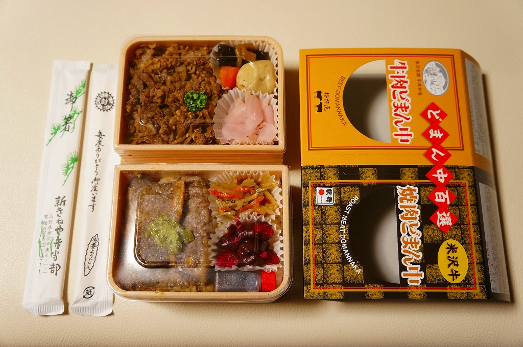 つまり、米沢駅の名物駅弁「牛肉どまん中」をハーフサイズにして、さらに「焼肉どまん中」なる部分を同じサイズでくっつけた。割り箸を2膳付けており、真ん中で千切ってふたつのミニ駅弁にすることもでき、調製表示も2枠書いてある。これはとてもユニークな試み。調製元はもちろん、「牛肉どまん中」の米沢駅の駅弁屋であるが、あくまでも東京駅限定の駅弁である。このシリーズは不定期での販売に見える。