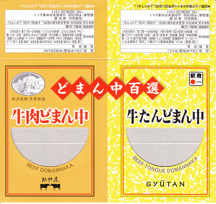 つまり、米沢駅の名物駅弁「牛肉どまん中」をハーフサイズにして、さらに「牛たんどまん中」なる部分を同じサイズでくっつけた。割り箸を2膳付けており、真ん中で千切ってふたつのミニ駅弁にすることもでき、調製表示も2枠書いてある。これはとてもユニークな試み。調製元はもちろん、「牛肉どまん中」の米沢駅の駅弁屋であるが、あくまでも東京駅限定の駅弁である。このシリーズは不定期での販売に見える。