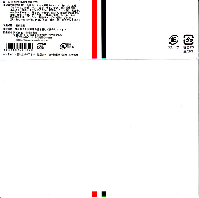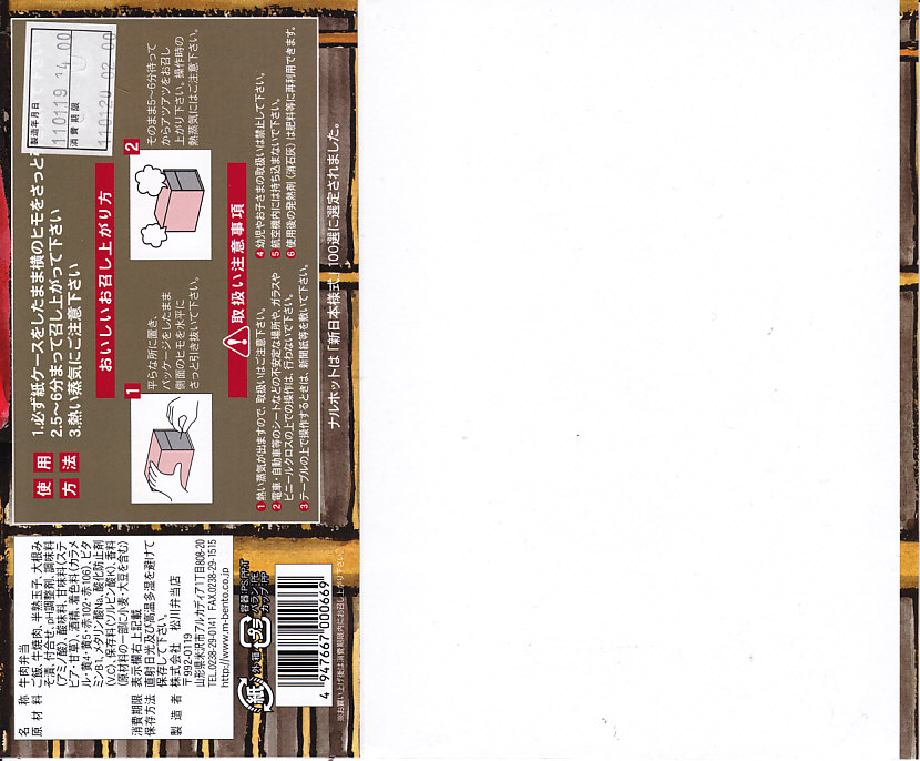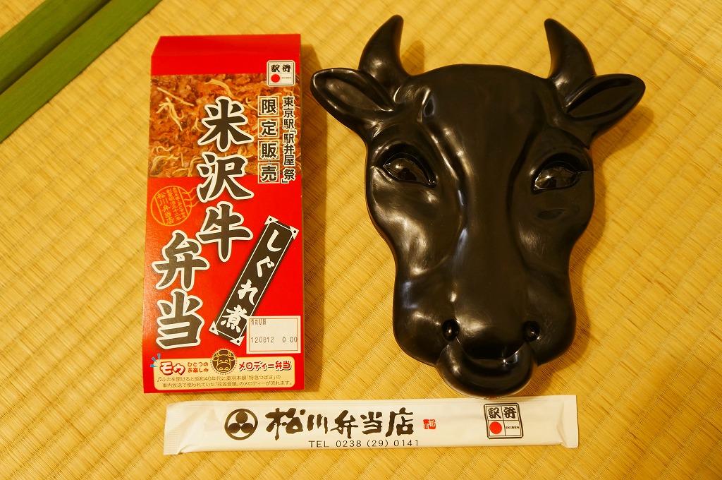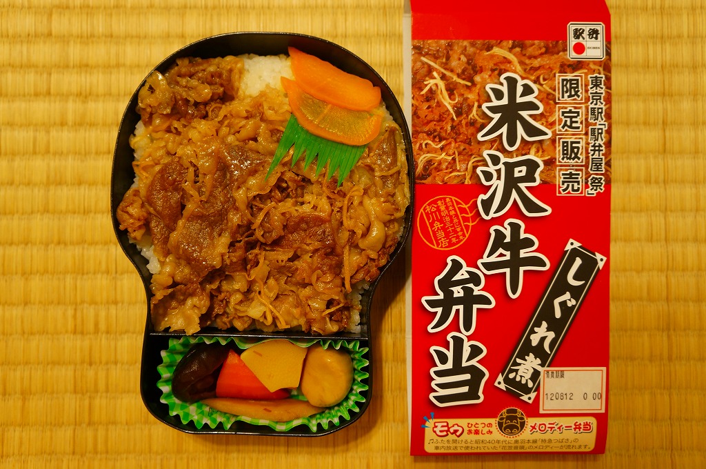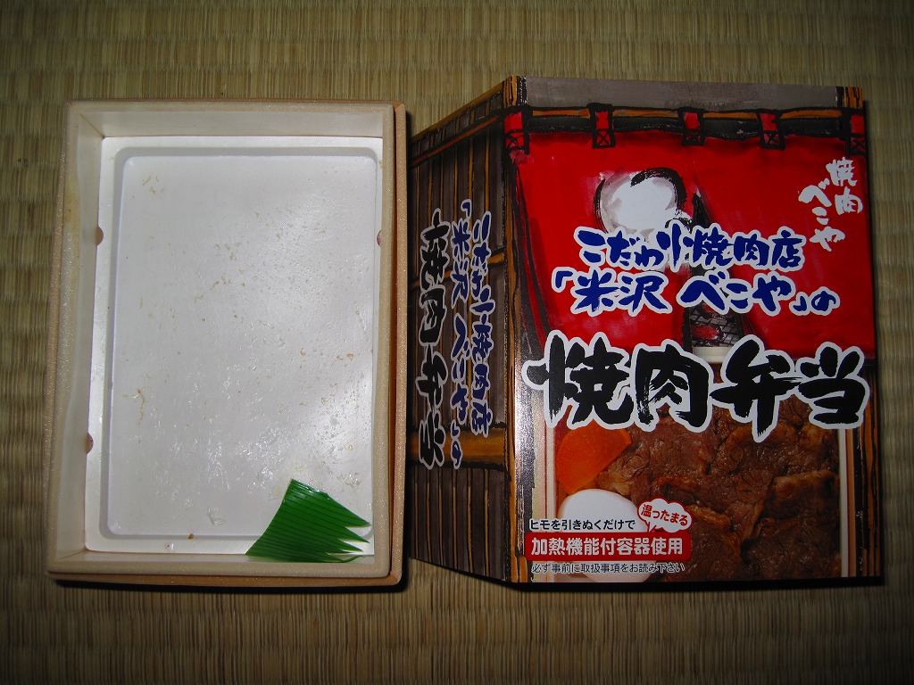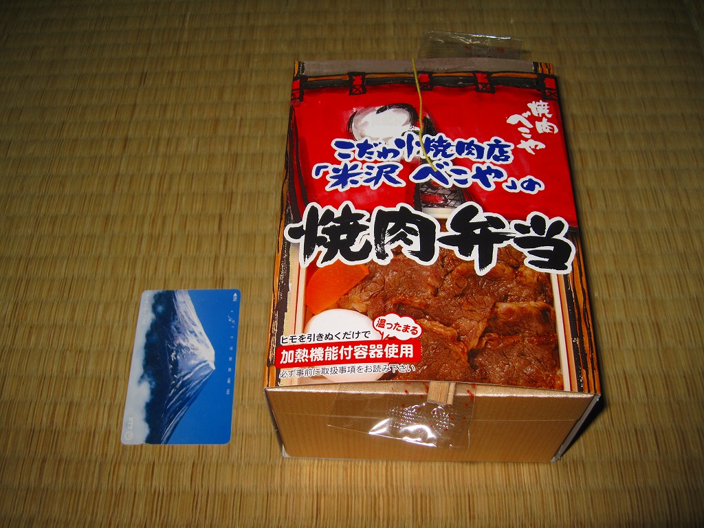 角のしっかりした直方体の加熱機能付き容器を、中身の写真や弁当の名前を印刷したボール紙の枠にぴったりはめる。中身は白御飯の上に牛バラ肉を貼り、半熟玉子とダイコン味噌漬を添えるもの。御飯の少量はともかく、肝心の肉が油だらけのうえ身が固い。宣伝が賑やかな分だけ、味は米沢の輸送駅弁より劣化した印象。