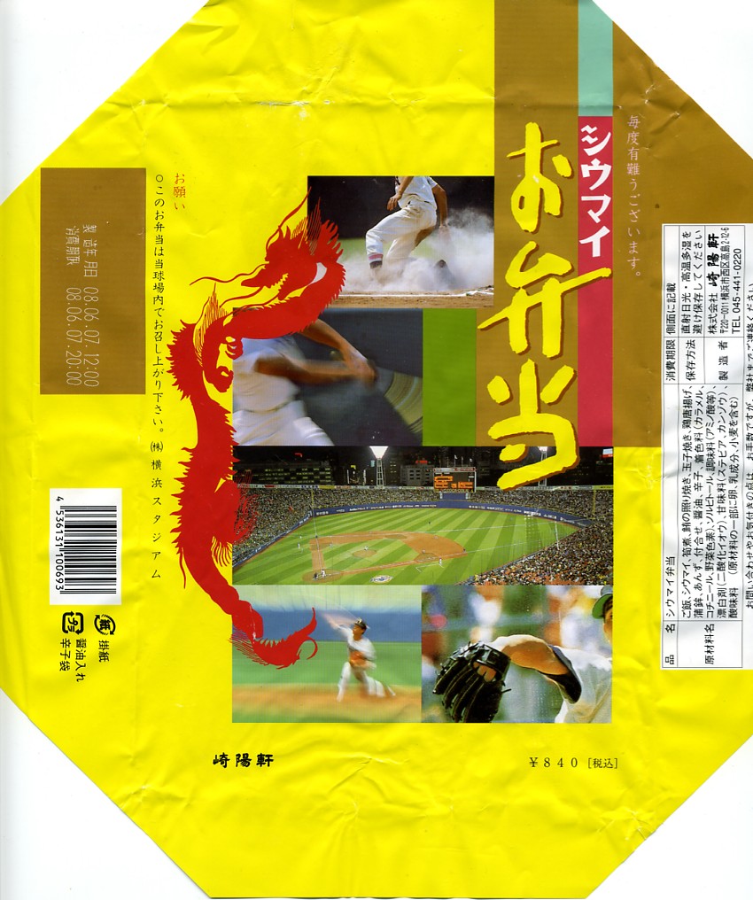 2008(平成20)年6月7日に購入した、横浜スタジアム限定発売のシウマイ弁当の掛紙。以前とまったく変わっていないように見えて、掛紙の写真には横浜スタジアムの改装が反映されているため、ちゃんと写真を撮り直して印刷をかけた模様。なかなか芸が細かい。他に上下の社名表示や右の食品表示などにも変化が見られる。