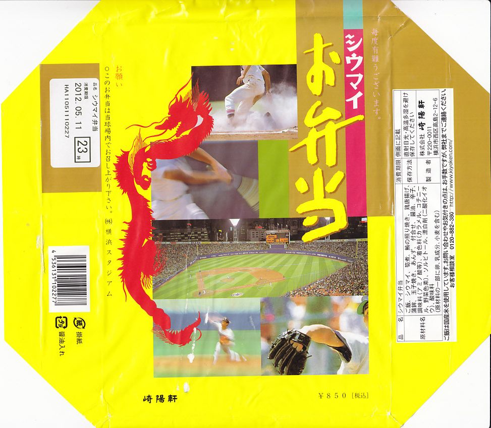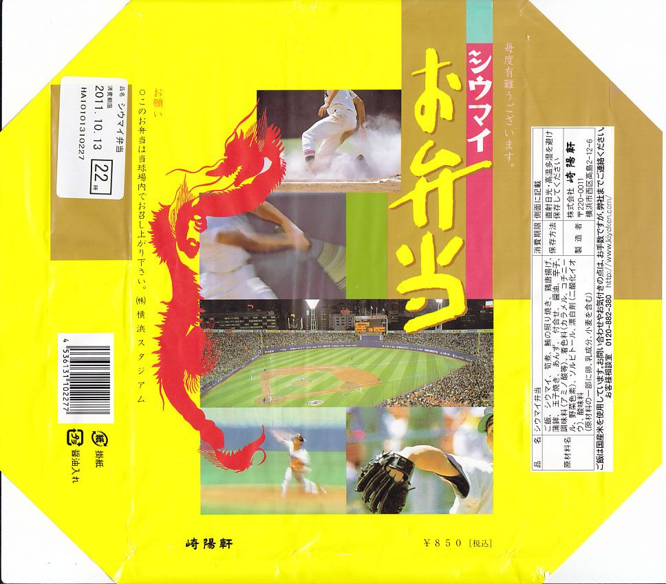 2011(平成23)年10月13日に購入した、横浜スタジアム限定発売のシウマイ弁当の掛紙。下記の2008年のものと比べて、食品表示やリサイクル表示と価格に変化が見られるが、使われている写真はまったく変わっていない。