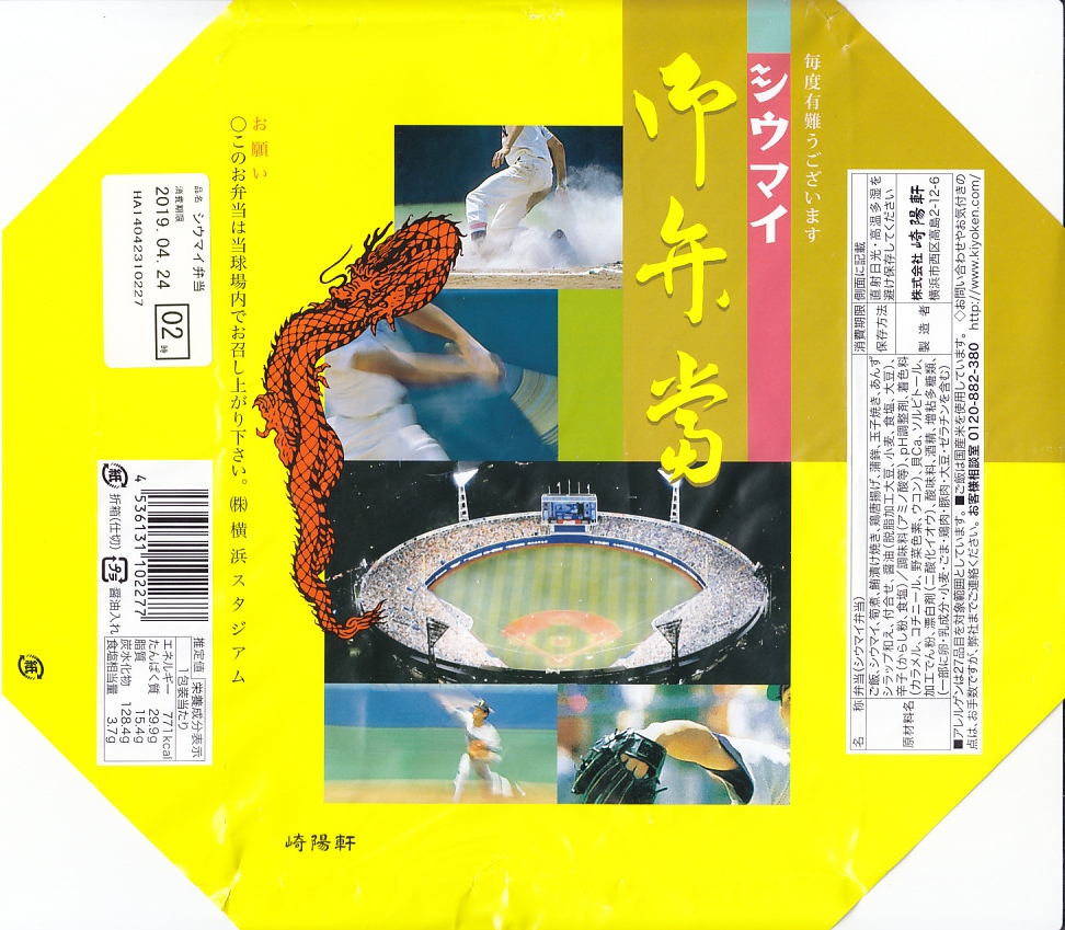 2019(平成31)年4月23日に購入した、横浜スタジアム限定発売のシウマイ弁当の掛紙。絵柄は下記の2016年のものから変わらず、法令の強化で食品表示が激増した。この絵柄は2021年プロ野球ペナントシーズンまで使われた。