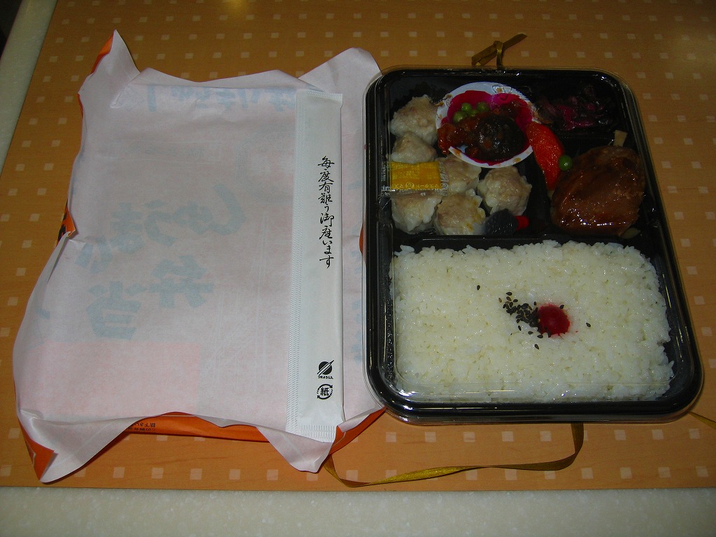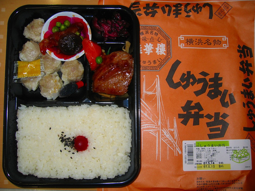仕出し弁当のプラ容器を、商品名を4箇所にも書いたオレンジ色の掛紙で包む。中身は日の丸御飯に小さめのしゅうまいが6個、焼マグロに、人参や椎茸などの煮物に、揚げ豚肉、柴漬けなど。横浜駅弁で有名な崎陽軒の「シウマイ御弁當」を、ホカ弁風にグレードダウンしたらこうなったという印象もあるが、駅弁のシウマイと比べてやや柔らかく薄味のしゅうまいにも、きっとファンがいると思う。