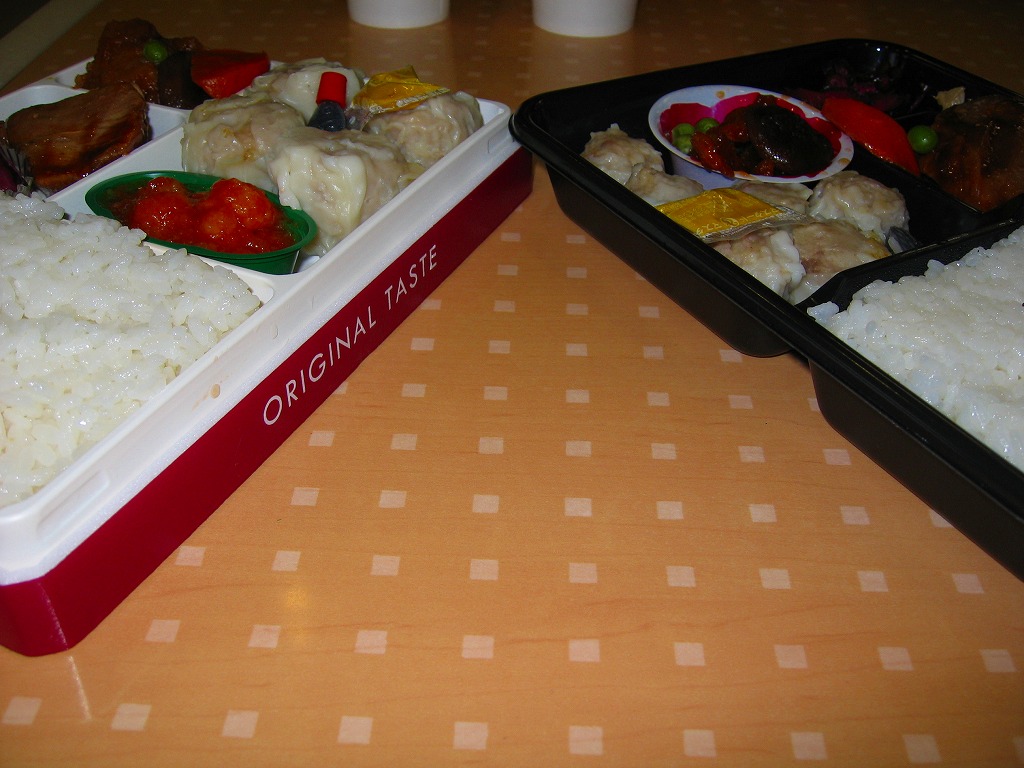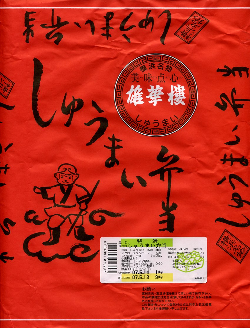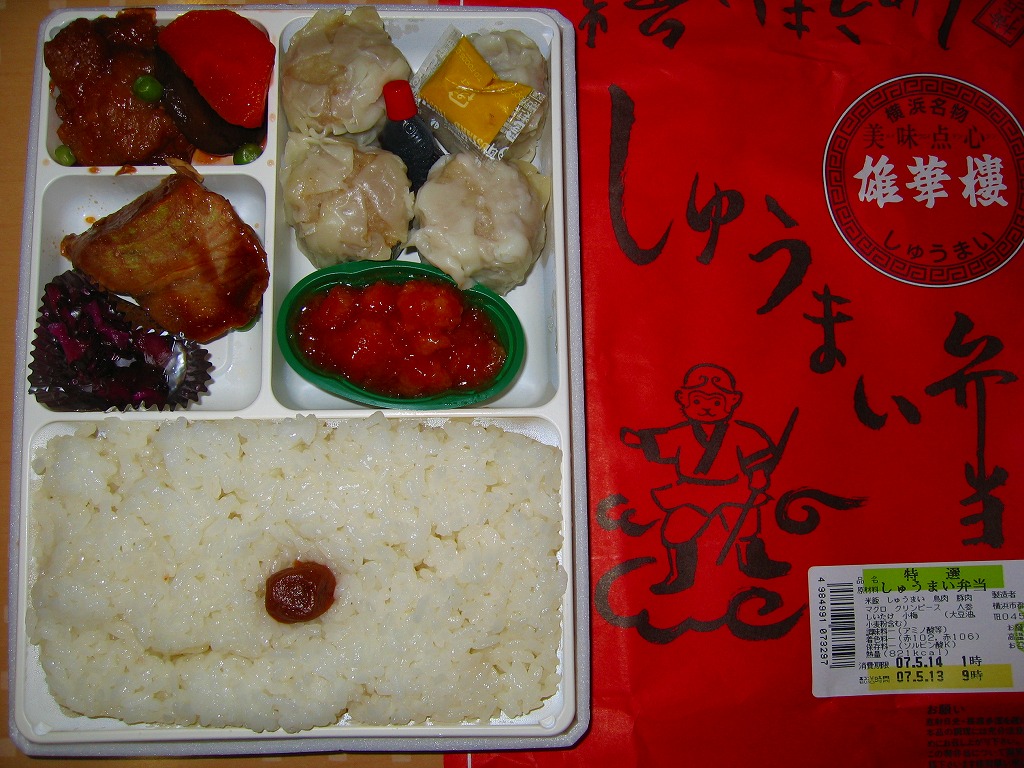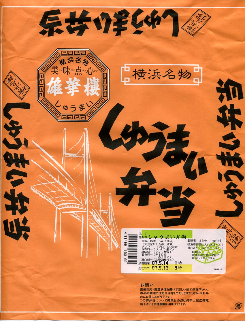 訪問時の海老名サービスエリアは、この弁当の掛紙にも書かれる「雄華樓」の焼売や豚まんが、土産物の主力商品として売り場面積と陳列個数が目立っていた。中華街の職人を戦前に招いて鉄道駅で商売にしたのが崎陽軒で、戦後に招いてドライブインやサービスエリアで商売にしたのが「雄華樓」ブランドの加次食品。今はいずれも横浜中華街に逆進出し店舗を持つ。