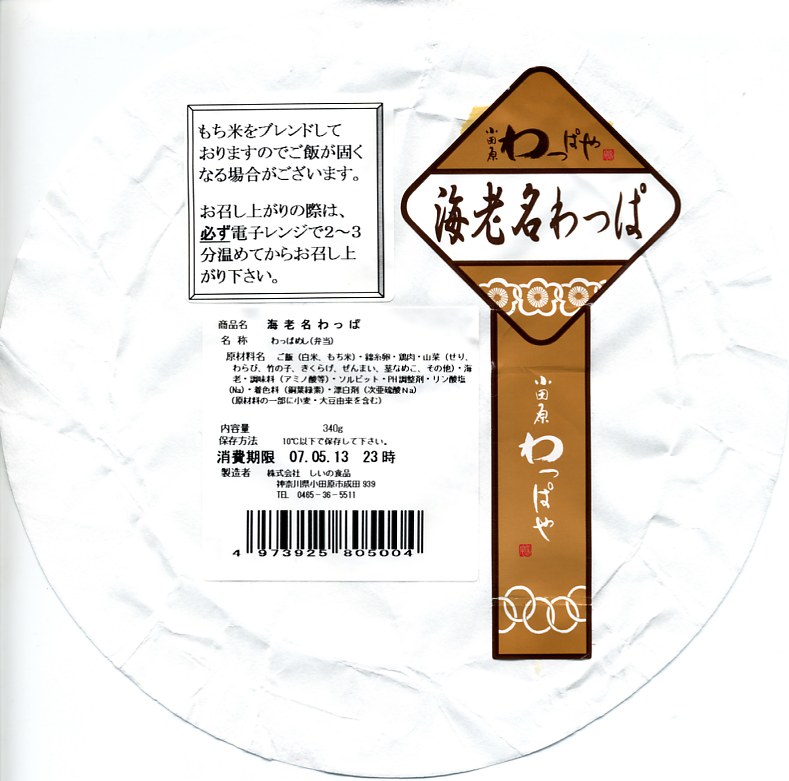「必ず電子レンジで2〜3分温めて」の注記のとおり、冷蔵や常温では食べられたものではないチルド商品。ところがクルマで自宅まで持ち帰ったら傷んでしまい、消費を断念した。冬場を除き車内に冷蔵設備がなければ、現地でチンして食べなければならない商品だった模様。多くのマイカーは居室が温室構造のはずだから、変な事故や評判にならなければいいが。製造者は小田原の弁当屋で、商品名シールにも「小田原わっぱや」と海老名でない地名が明記される。