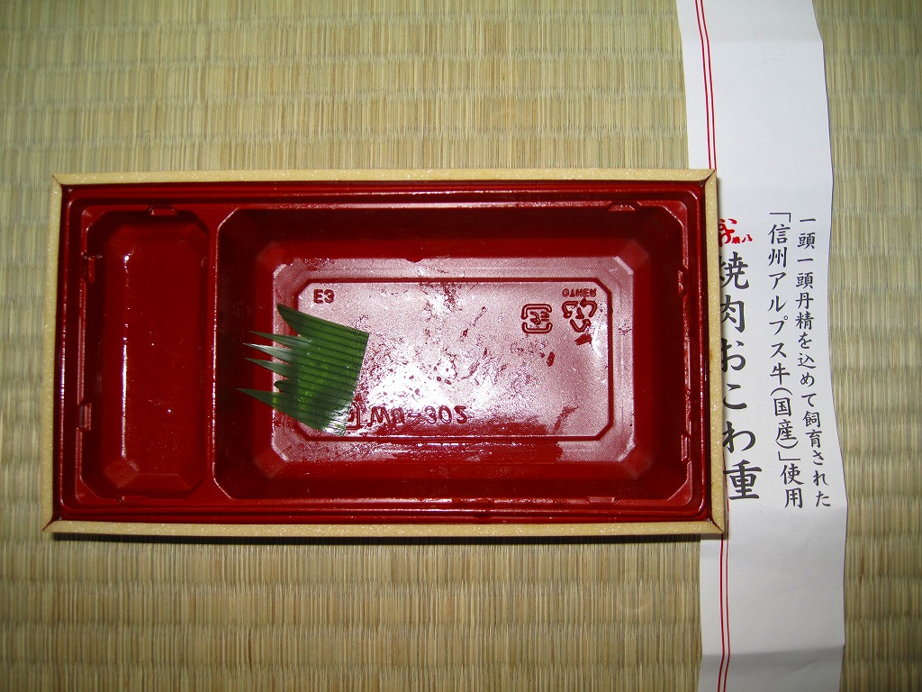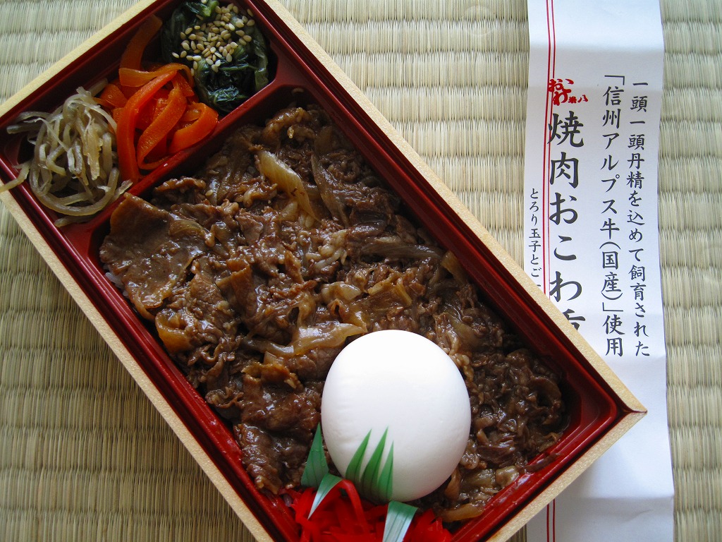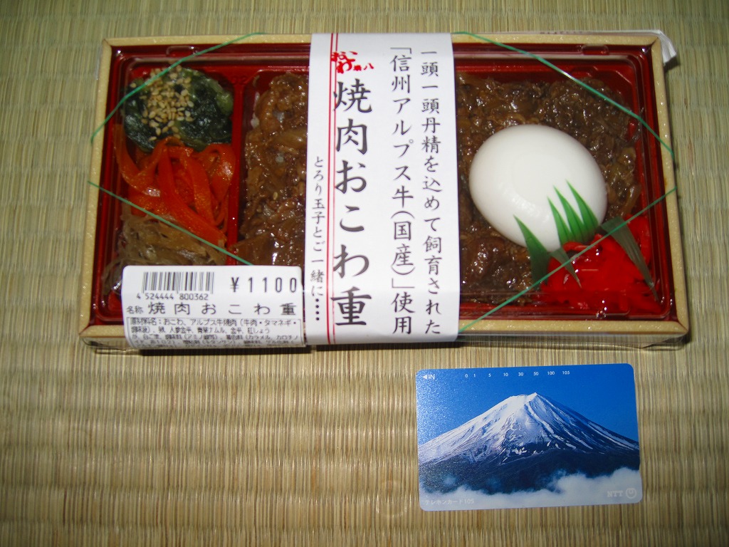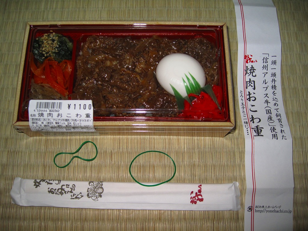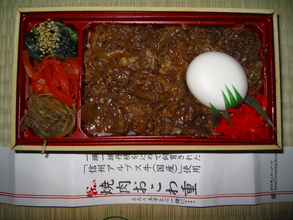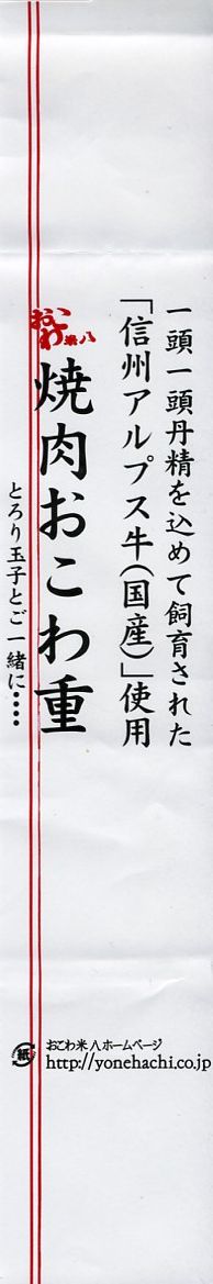 デパ地下や羽田空港でおなじみのブランドによる焼肉弁当。赤いトレーを接着した長方形の容器に透明なふたをして、商品名や宣伝文を書いた紙帯を締め、食品表示ラベルと輪ゴムで留める。中身はおこわの白飯の上を信州アルプス牛の焼肉で多い、半熟卵と紅生姜を添え、ニンジンとゴボウのきんぴらと青菜ナムルを付けるもの。御飯がおこわという点がとても珍しいしこのブランドらしい、韓国風焼肉弁当。分量の割に高価な気はする。なお、高速道路のサービスエリア向けの商品ではない模様。