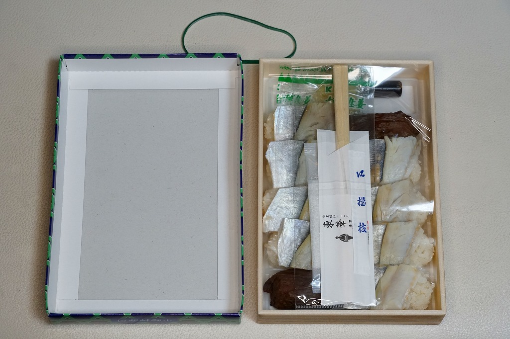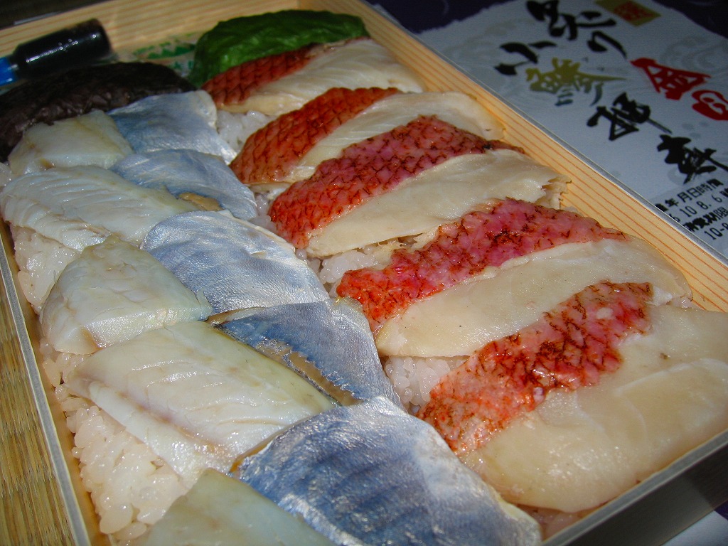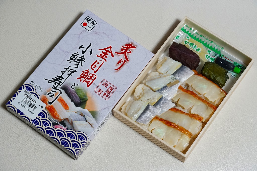 2006(平成18)年7月の発売。伝統の駅弁「小鯵押寿司」と、2005年発売の「金目鯛炙り寿司」を4個ずつ入れて、しそ巻き御飯と広島菜巻き御飯も1個ずつ詰めて、おろししょうが、甘酢生姜、ねりわさび、醤油を添える。見栄えはおとなしいのに中身は盛りだくさん。風味は両者の評判どおり。価格は2011年時点で1,300円、2014年時点で1,350円、2022年6月16日から1,450円、2024年6月から1,480円、2025年6月から1,580円。
