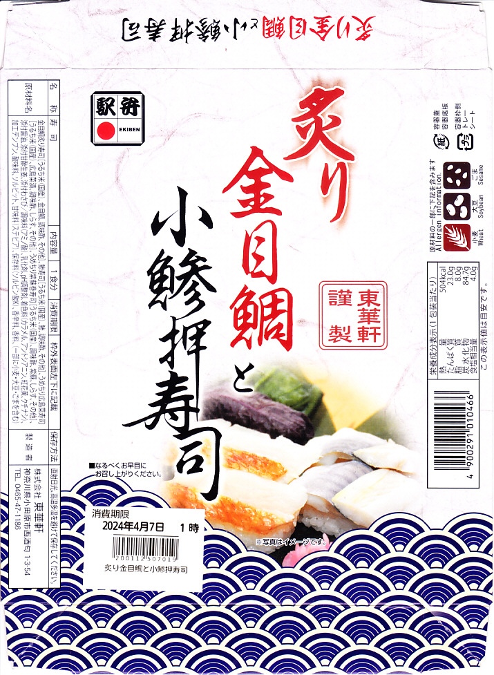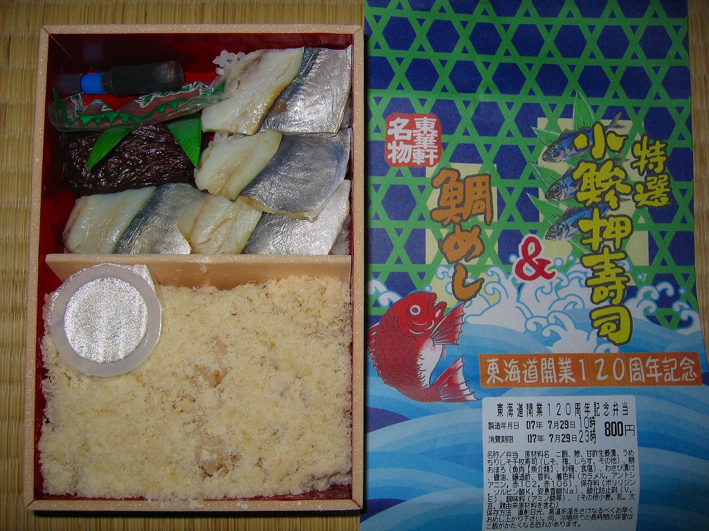 東海道本線横浜・国府津間の開業120周年を記念して、2007(平成19)年7月14日から29日までの土休日に販売された記念駅弁。掛紙のデザインと中身は駅弁の名前どおり、小田原の名物駅弁「小鯵押寿司」と「鯛めし」が半分ずつ。風味も当然に、それらと同じ。