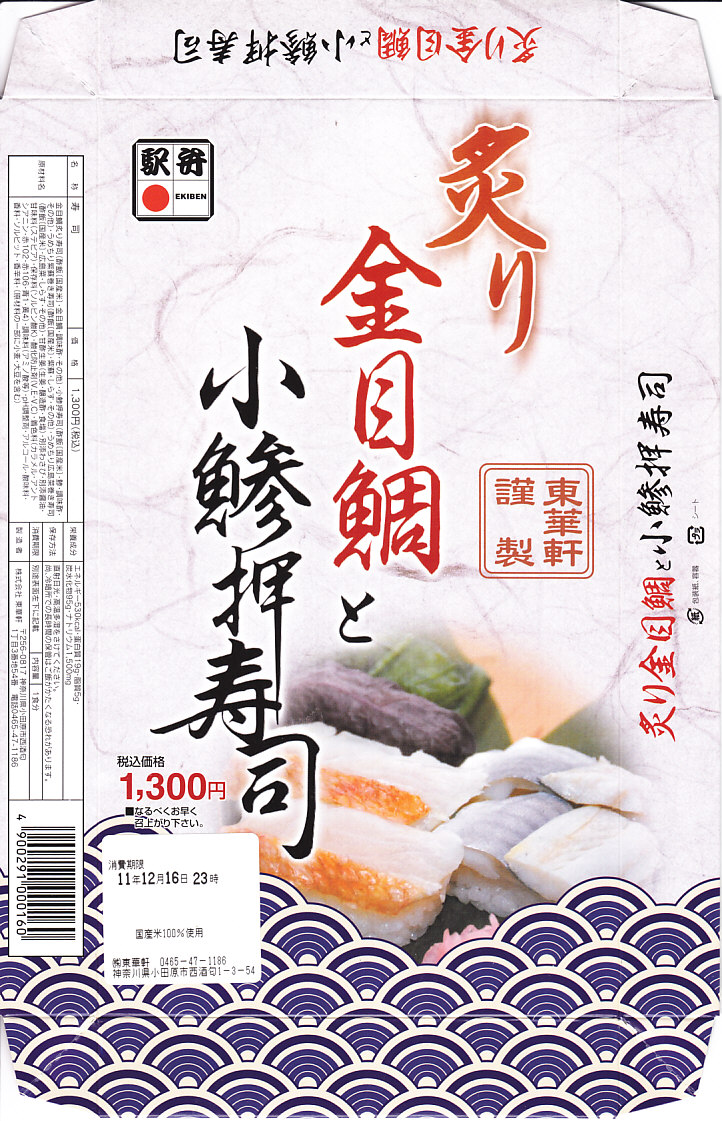 2011(平成23)年12月16日に購入した、小田原駅弁のふた。絵柄や内容は、上記の2024年のものと変わらない。この当時は炙り金目鯛と小鯵押寿司が1個ずつ多く、そのため容器が縦に少し長い。