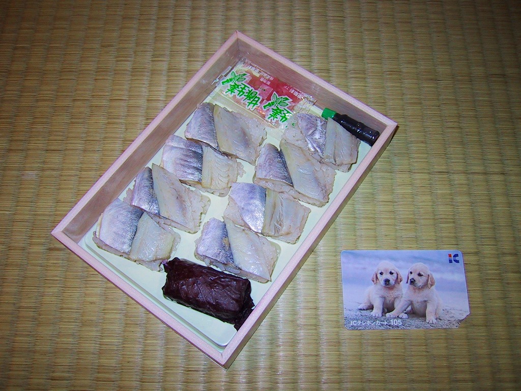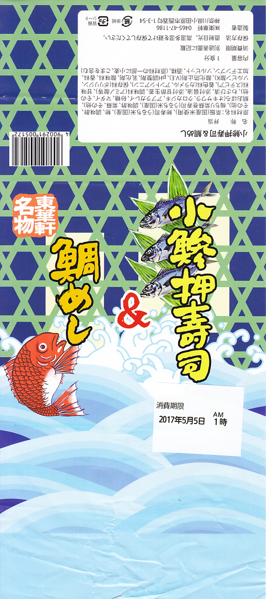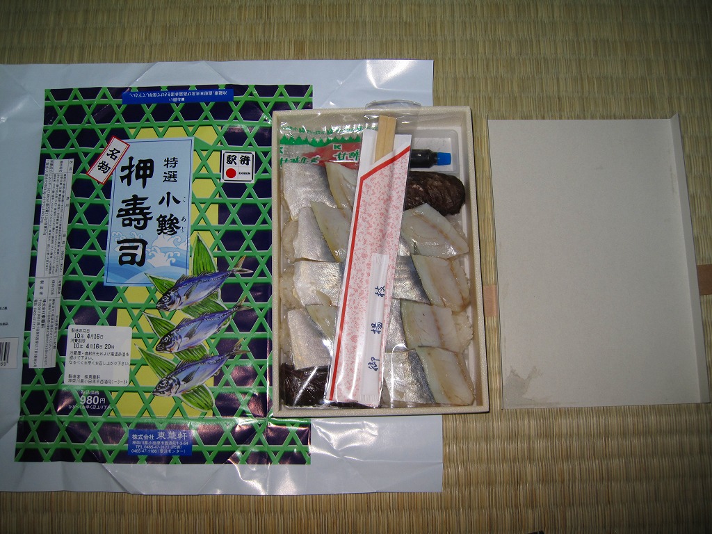 小田原駅弁「小鯵押寿司」は2001(平成13)年当時、現在の小鯵押寿司8個としそ巻き寿司2個のものに加えて、小鯵押寿司が2個多いものも併売されており、こちらを「M」、あちらを「S」と呼び分けていた。包装紙の絵柄は同じ。いつまで売られたかは分からない。