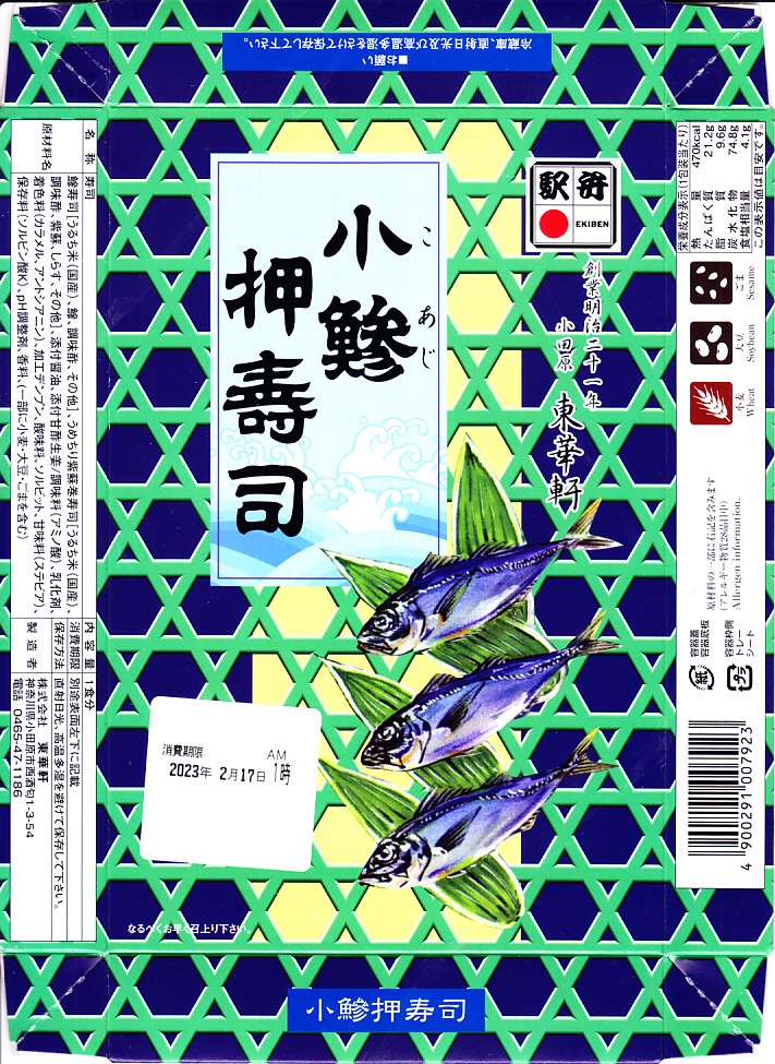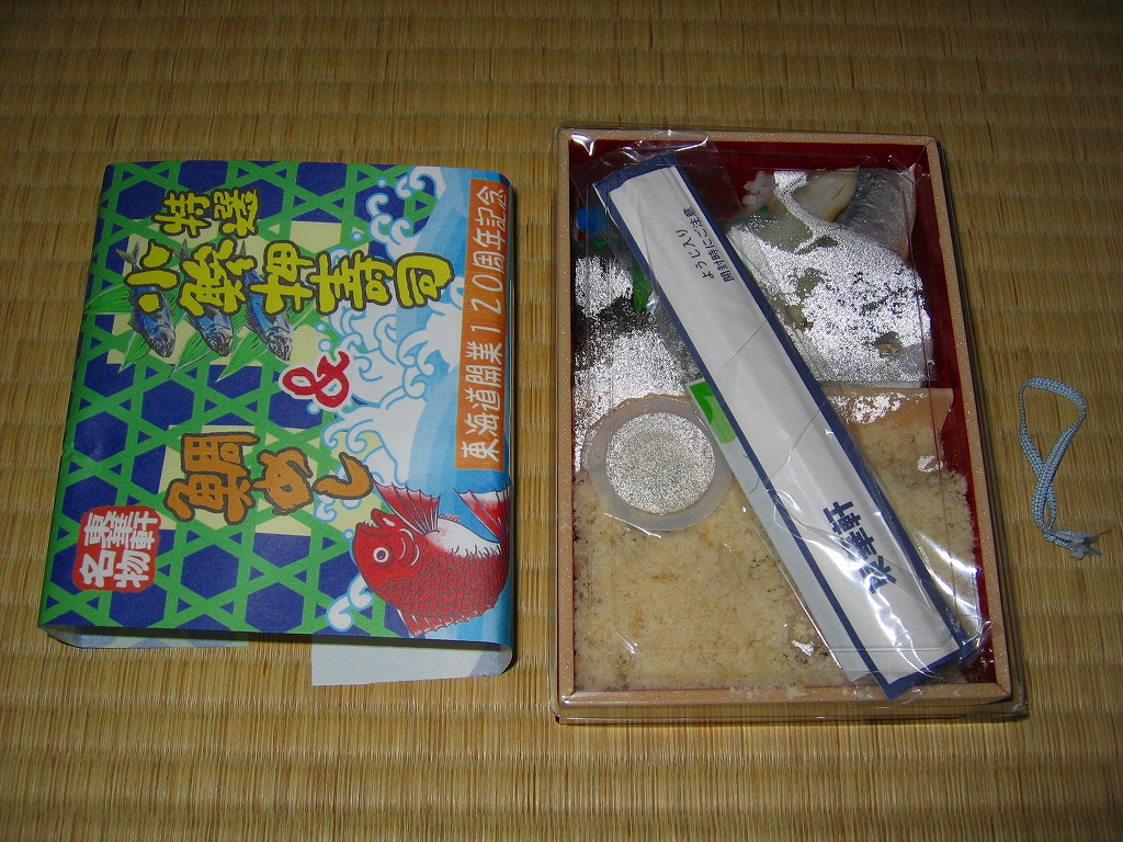 1903(明治36)年に国府津駅で誕生した伝統の駅弁。小アジの押し寿司8個と、しそ巻き寿司を2個、プラ製の白いトレーに並べ、甘酢生姜と醤油を添え、薄い容器に収めて、ボール紙のふたをする。このような駅弁は東隣の大船駅にもある。当時は相模湾でアジがふんだんに獲れ、これが沿岸の駅弁となったもの。こちらの駅弁は近年では紹介例が少ないが、昭和時代から変わらない内容と風味で、小田原駅や熱海駅などで売られている。価格は2019年の購入時で1,030円、2022年6月16日から1,100円、2023年6月から1,200円、2025年時点で1,280円、6月から1,380円。