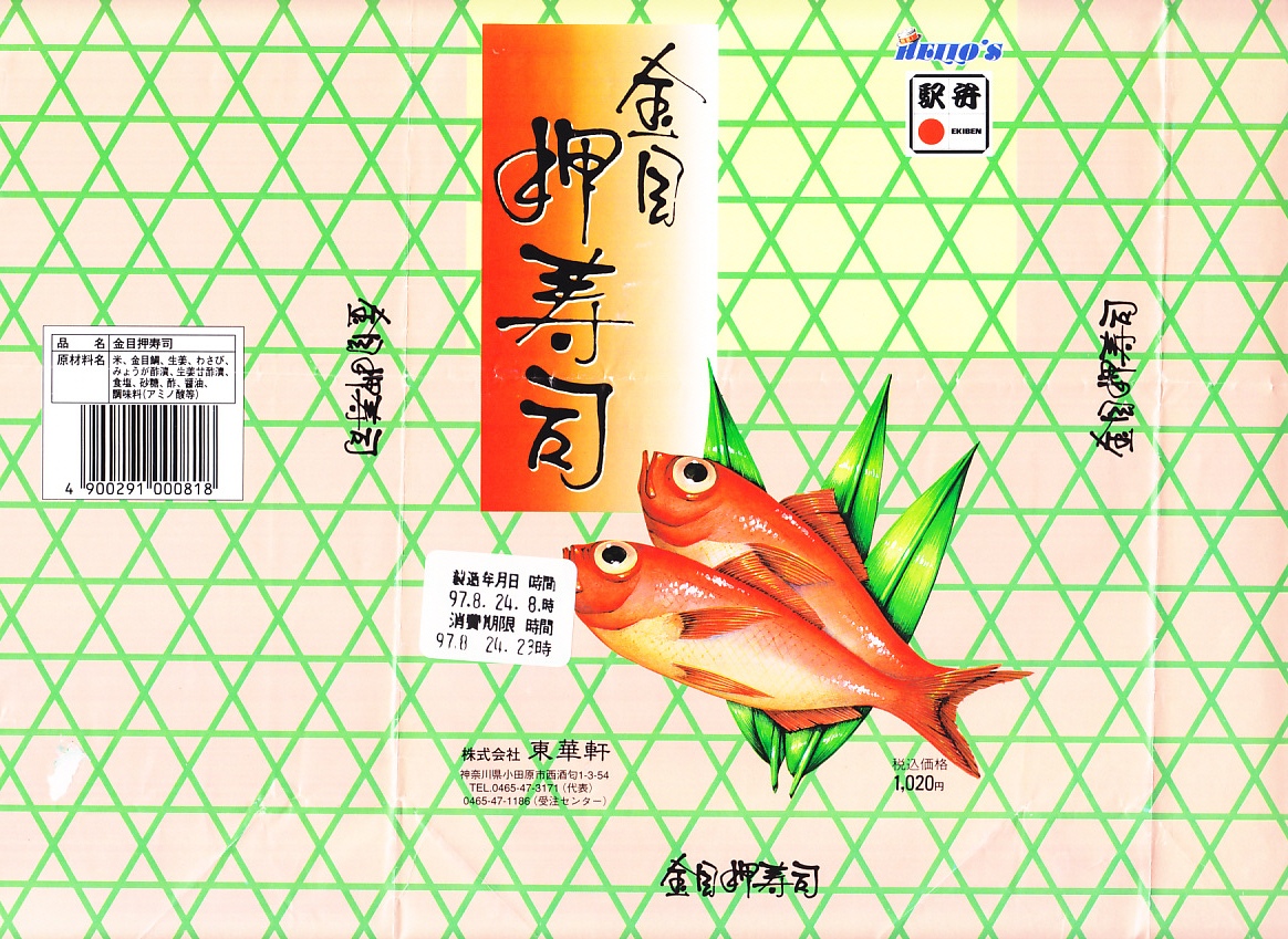 1997(平成9)年8月24日8時の調製と思われる、昔の小田原駅弁の包装紙。上記の2002年に購入したものと同じ絵柄で、小田原駅弁「小鯵押寿司」のキンメダイ版という印象。