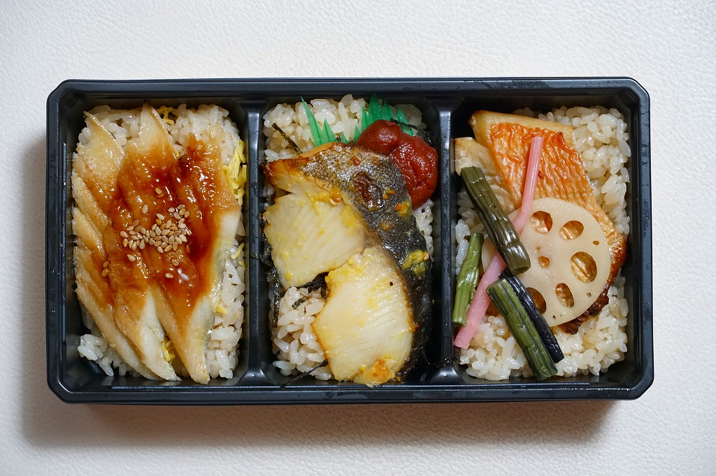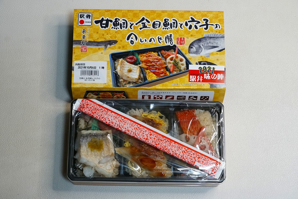 2021(令和3)年7月に発売、10月にJR東日本の駅弁キャンペーン「駅弁味の陣2021」にエントリー。容器の3区画すべてに茶飯を詰め、甘鯛の塩焼きに柚子胡椒と梅干し、煮穴子とタレと錦糸卵、金目鯛の照焼きにハスとワラビとはじかみを載せる、御飯と御飯と御飯の内容。3種の魚介類の香りと、それらを引き立てる味付けと付合せと御飯の協調が印象的で、列車内でなくても、駅弁でなくても、おいしくいただけるお弁当だと思う。スリーブには中身の写真と3種の食材を描いた。2022年5月限りで終売。