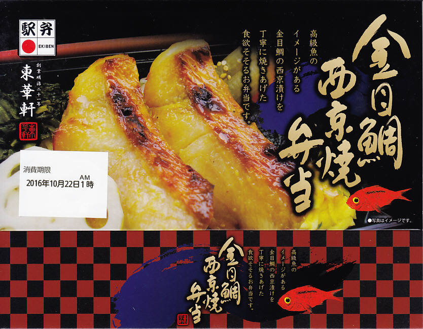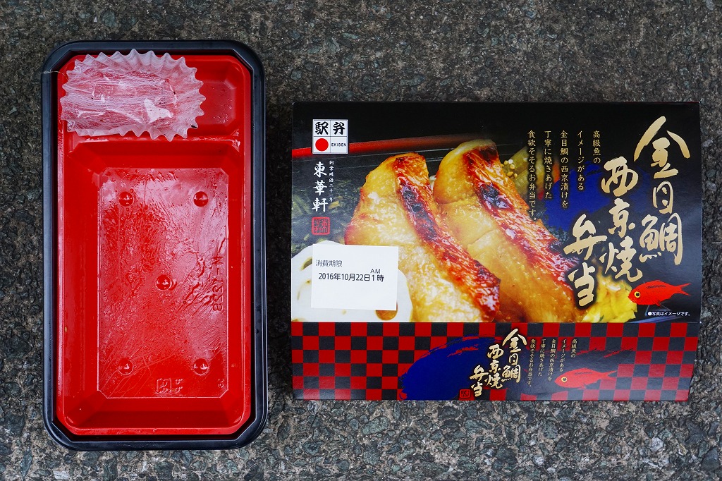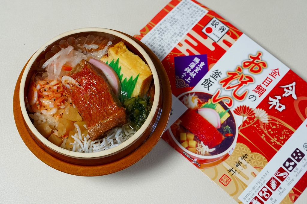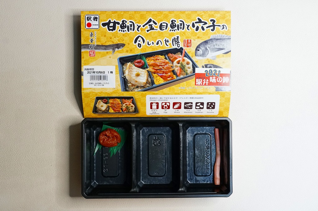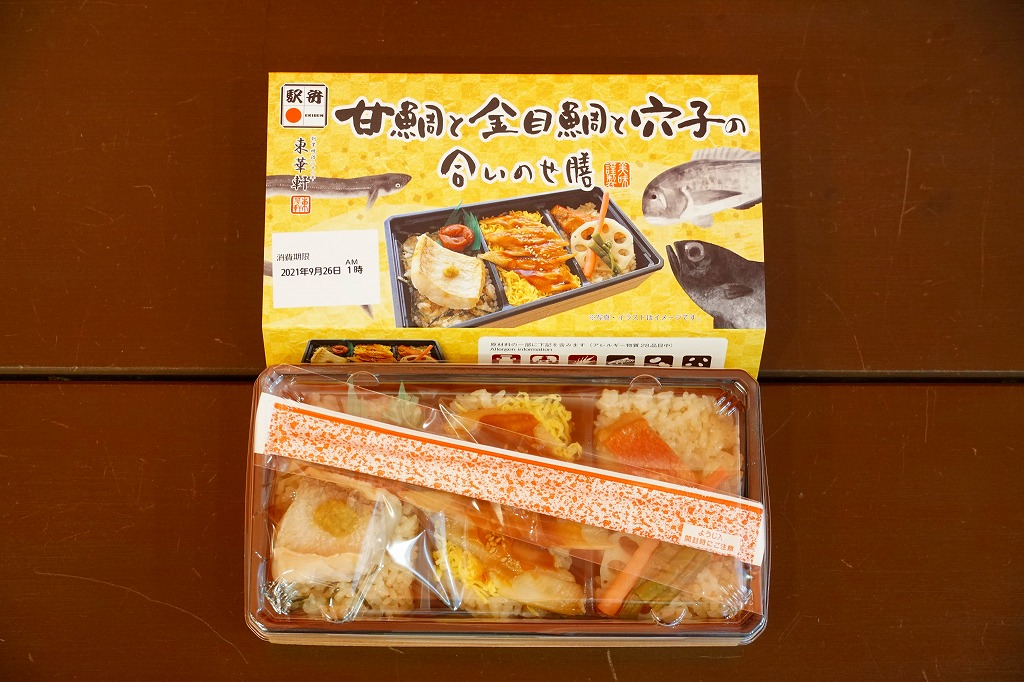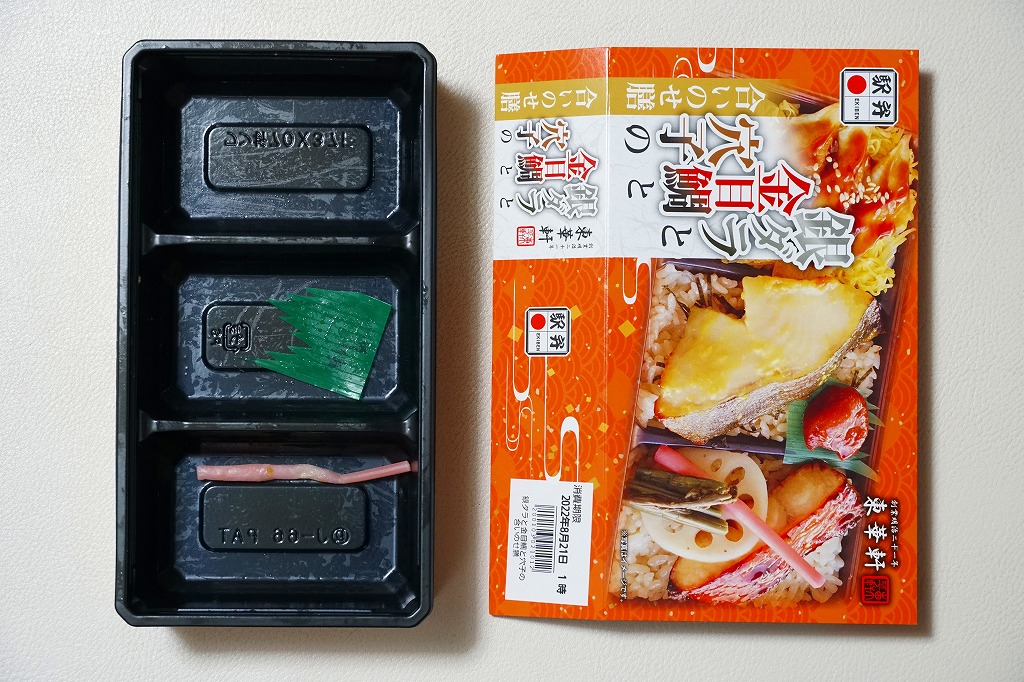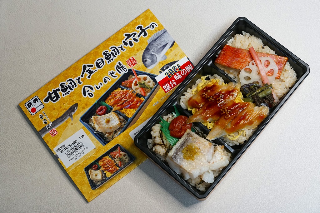 飯も魚も、コンビニでの冷蔵販売で冷たいのに、ふんわりとした味わい。そんな味に影響はないものの、駅弁らしいボール紙枠に収める安っぽいプラ製容器はともかく、メインの金目鯛は公式サイト写真の半分程度の大きさにしか見えず、散らす具は乱雑で、見栄えの工夫がもっと欲しいところ。価格は2016年の購入時で950円、2022年6月16日から1,050円、2023年6月から1,100円、2024年5月11日から1,230円、2025年2月から1,280円、6月から1,380円。